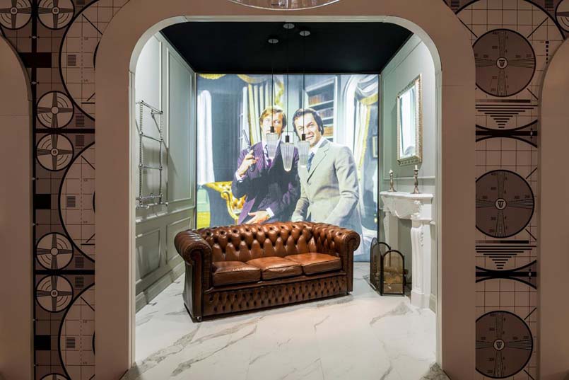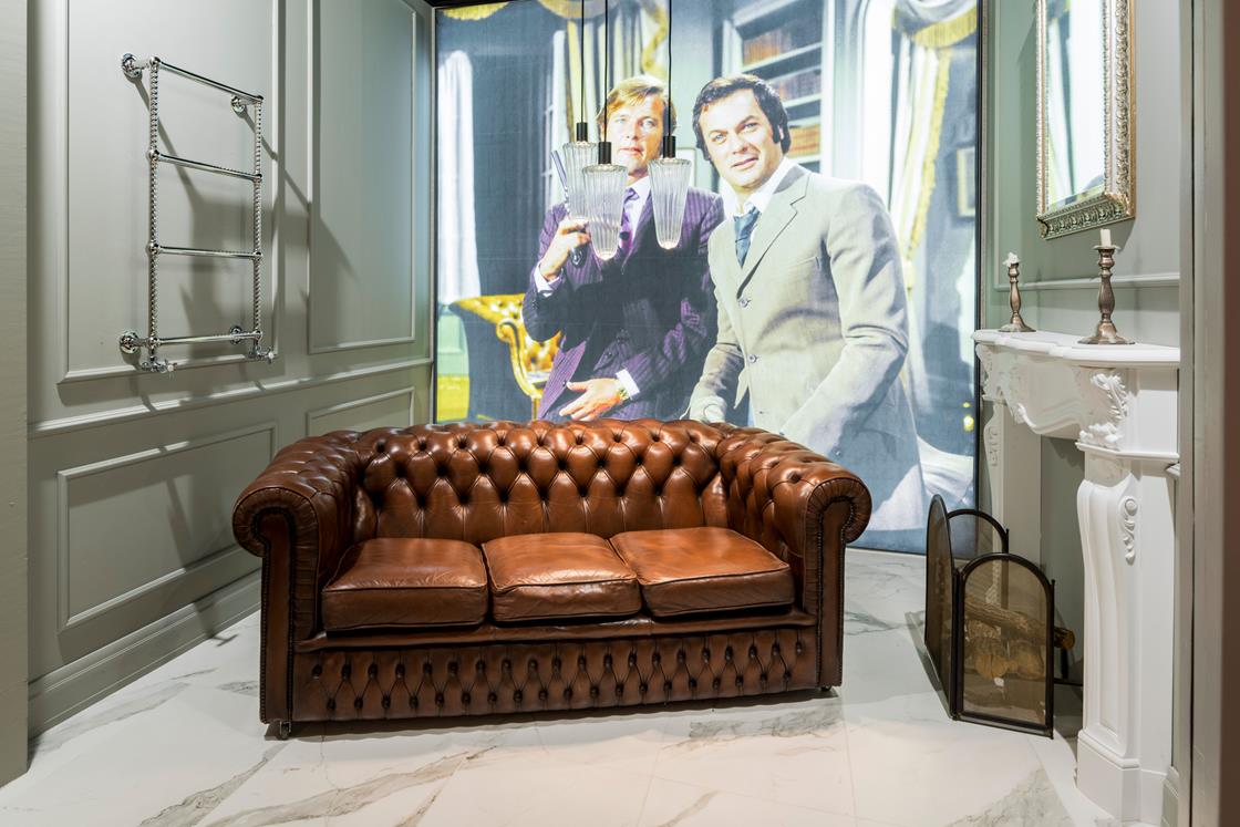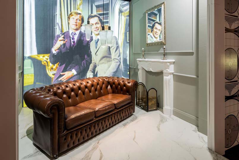 - Slimtech Timeless Marble è stata utilizzata per una seconda installazione, all’interno del quartiere fieristico, dedicata alla fiction “Attenti a quei due”. Le venature marmoree del colore Calacatta Gold Extra, posato in grandi lastre ultrasottili 50×100, hanno contribuito a rievocare le atmosfere della serie televisiva inglese.