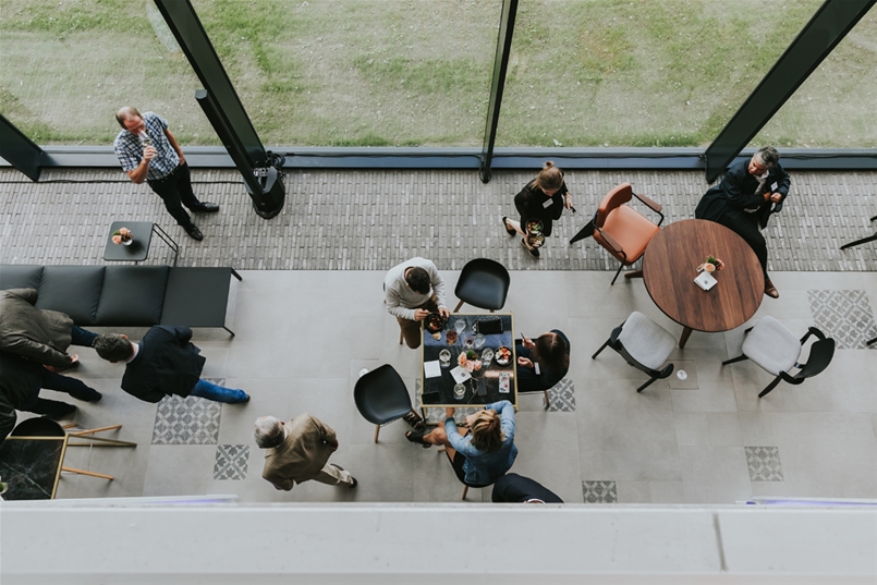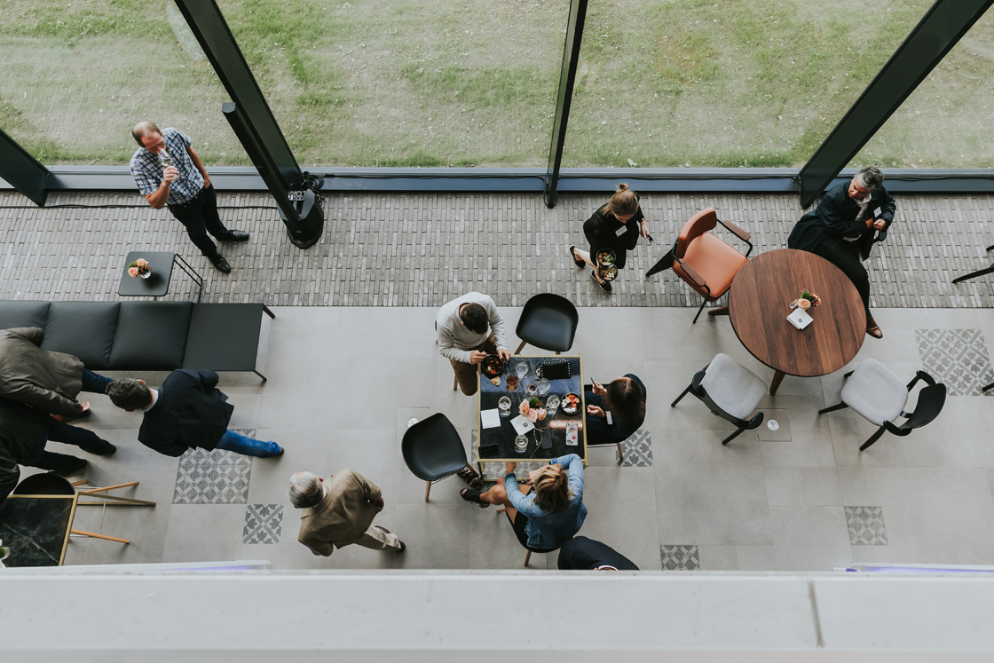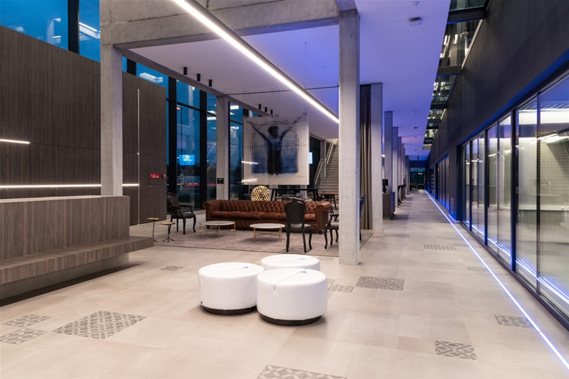 I moduli District nella delicata nuance Boulevard esaltano la luminosità degli spazi e attraverso le grandi vetrate, accolgono il fascino della natura circostante. La composizione multiformato della posa, intervallata da pattern geometrici del decoro, ricrea un paesaggio più domestico ed accogliente nelle aree dedicate alla convivialità.