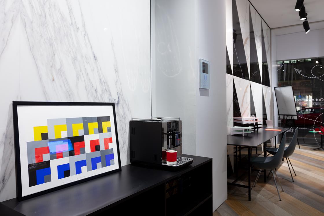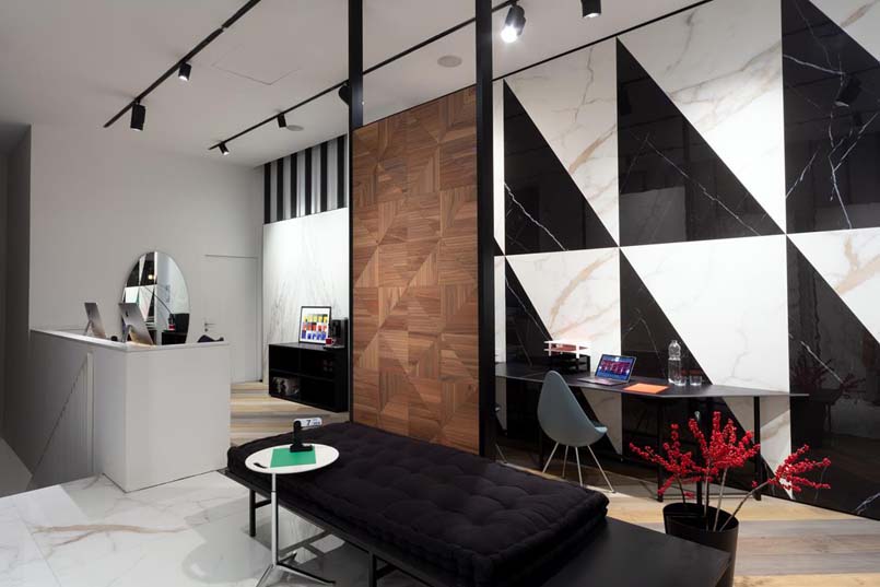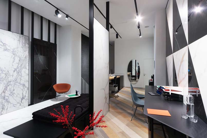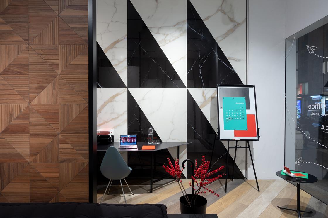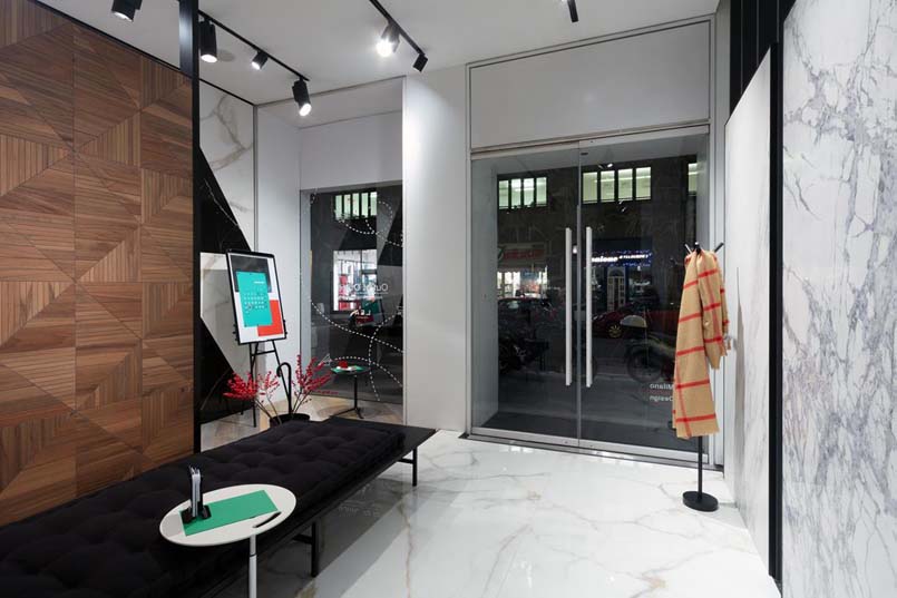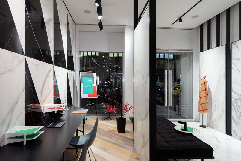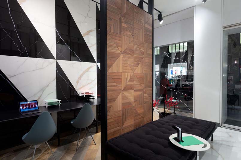 Firmata da Diego Grandi la nuova vetrina milanese di Lea Ceramiche Showroom  interpreta le ultime tendenze degli spazi di lavoro