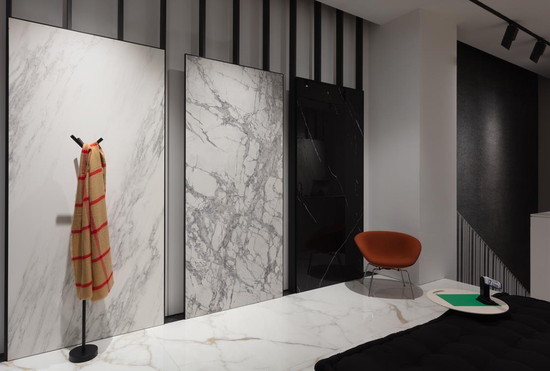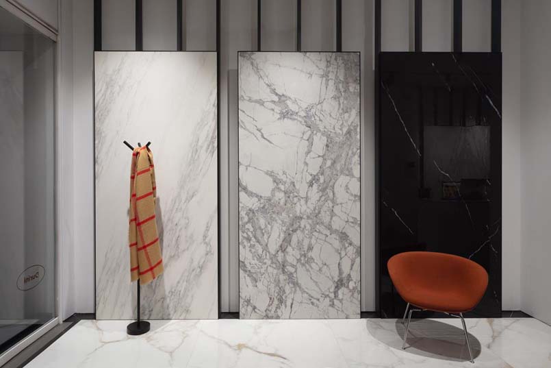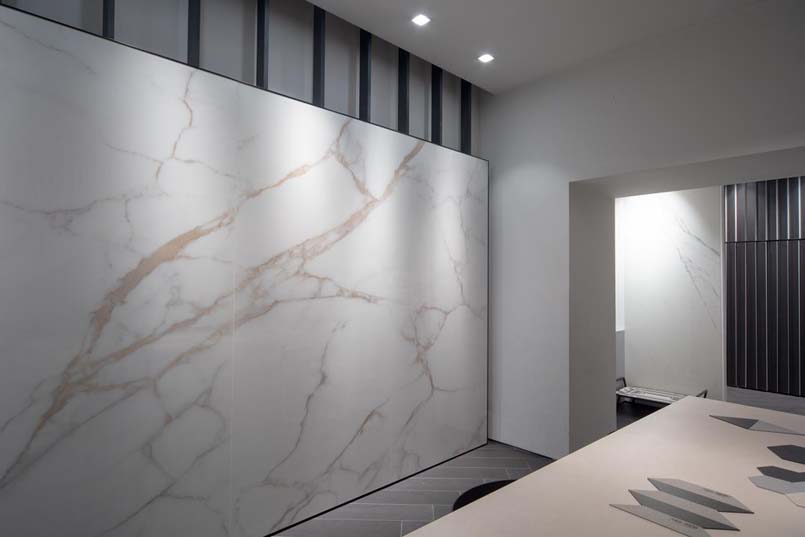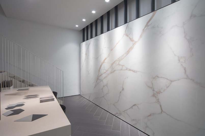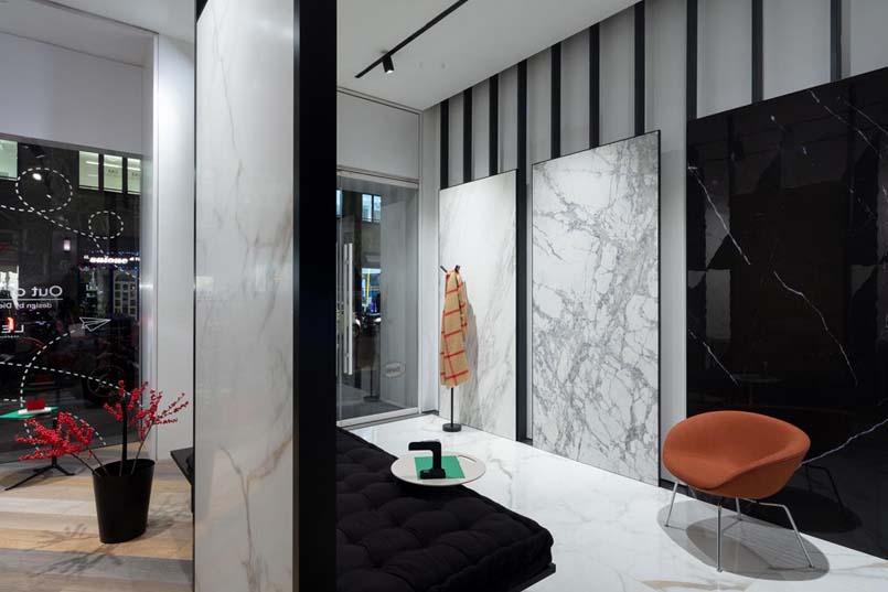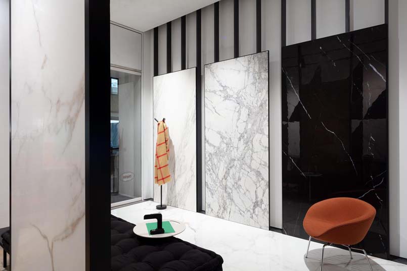 Protagoniste del progetto le nuove collezioni Slimtech Delight e Bio Select che, presentate in anteprima all’ultima edizione di Cersaie, vengono declinate nello spazio di via Durini secondo l’interpretazione e la cifra stilistica del designer. Snodandosi lungo le pareti e il pavimento, le pareti suddividono il perimetro dello spazio per evidenziare le peculiarità di ciascuna.