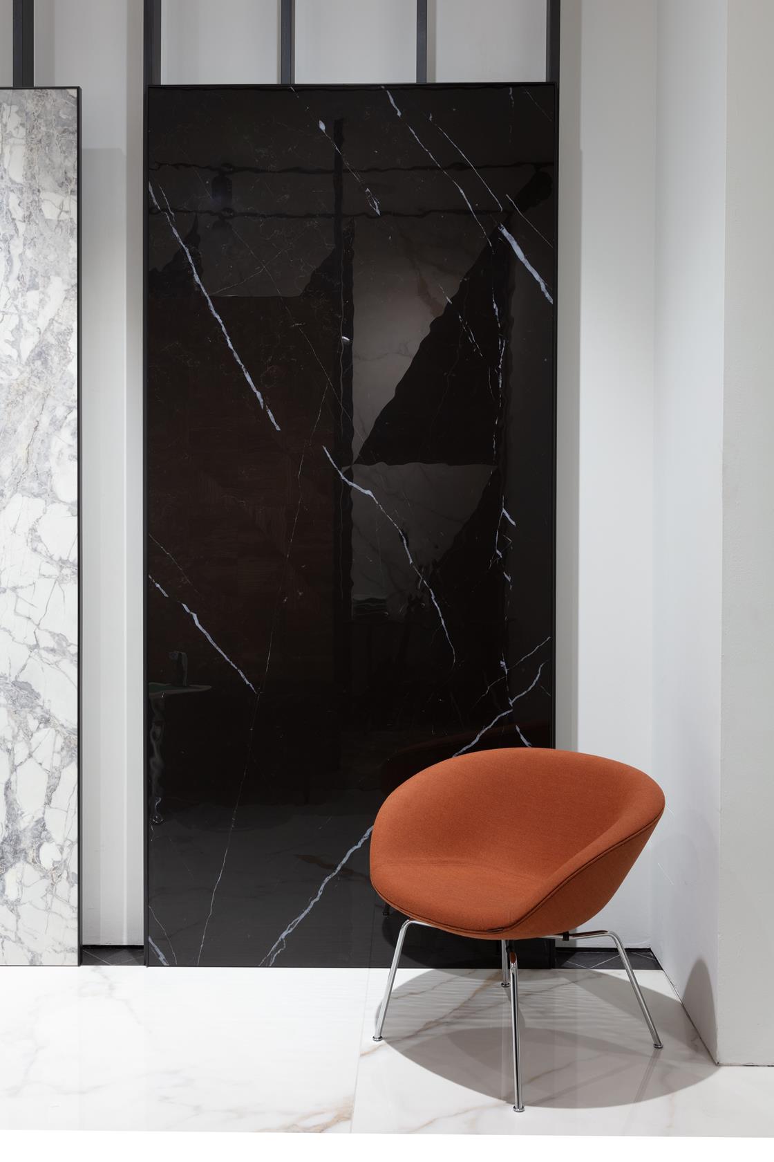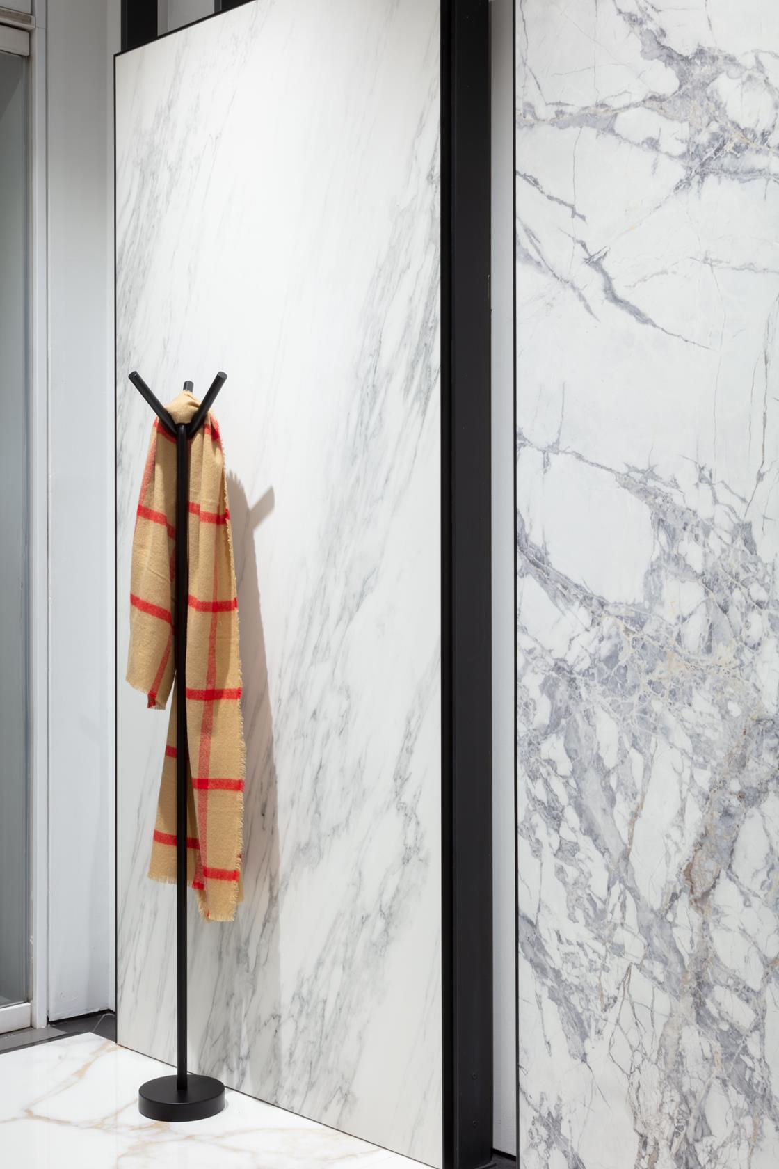 Una forte presenza dei disegni marmorei dal grande impatto visivo, caratterizza Noblesse, una grande collezione di 12 sfarzosi marmi ceramici scelti tra le essenze naturali più nobili, delle quali celebra la bellezza senza tempo, tra colori vibranti e innovativi e nuance classiche ricalibrate. A pavimento il marmo più riconoscibile, Calacatta Oro, percorre la superficie nell’elegante finitura levigata e nelle imponenti lastre in gres laminato Slimtech (extra formati fino a 120x278 cm) dallo spessore sottile di soli 6mm. Sulle pareti, si susseguono le altre variazioni estetiche, Invisible Light, Venato Bianco: proposte nelle differenti finiture, le grandi lavagne consentono di relazionarsi con la fisicità della materia, sperimentandone le diverse sensazioni tattili e visive. Alle tradizionali finiture Lev, che richiama la classica levigatura del marmo e Nat, opaca e materica, viene infatti introdotta la nuova finitura Touch, morbidissima al tatto e vellutata: una lavorazione della superficie che esalta la venatura e la profondità delle pietre a cui la collezione si ispira.