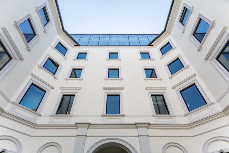 Firmato da Vittorio Grassi Architetto & Partners, il progetto ha affrontato il restauro e l’ampliamento degli interni rispettando l’edificio storico e conferendo agli spazi ampia flessibilità e versatilità per ospitare 500 postazioni, dislocati su 5 piani, per un totale di circa 9000 mq. Sia per il restauro conservativo dell’immobile che per l’inserimento di elementi contemporanei, come all’ultimo piano, la copertura sostituita da una terrazza e un volume di vetro trasparente o come il cortile interno, un tempo adibito a posti auto e ora trasformato in un verdeggiante giardino, nel progetto “Principe Amedeo 5” sono stati utilizzati molti materiali ecologici riciclati o riciclabili, dimostrando una evidente attenzione al tema della sostenibilità ambientale.
