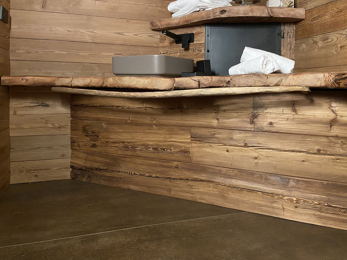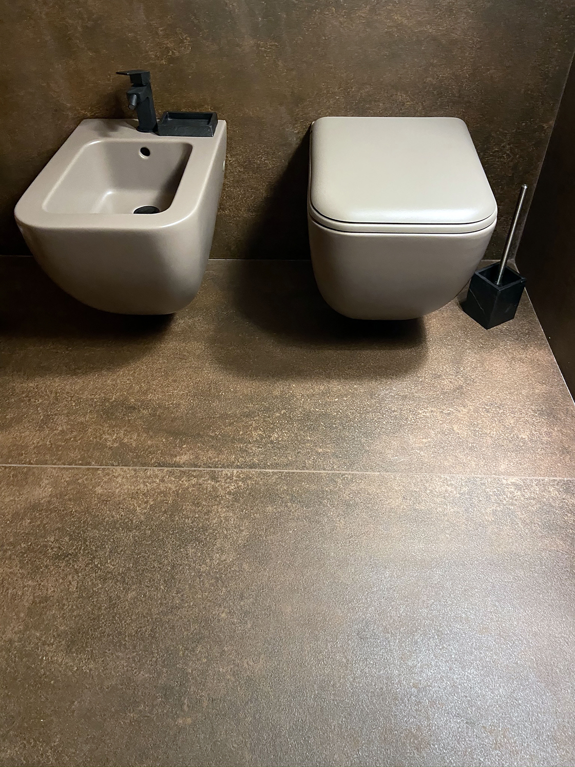 Le grandi lastre sottili di Lea Ceramiche definiscono il piano seminterrato e i bagni del piano suite. Nel seminterrato i progettisti hanno prediletto l’effetto speciale del simbolo dell’architettura moderna, il cemento: la collezione Concreto Slimtech nella nuance Light, formato 60x120 cm e spessore di 6 cm, conferisce vigore e contemporaneità a un ambiente tra il vintage e il super moderno. Nei bagni delle suite, invece, per sviluppare un mix tra minimalismo e design, è stata scelta l’affascinante tonalità Rust, la quale aggiunge suggestione e calore all’intimità e al relax. Per la massima tranquillità degli ospiti, inoltre, entrambe le versioni sono realizzate con Protect®, l’esclusiva tecnologia antibatterica che elimina 24h/24 fino al 99,9% dei batteri dalla superficie.