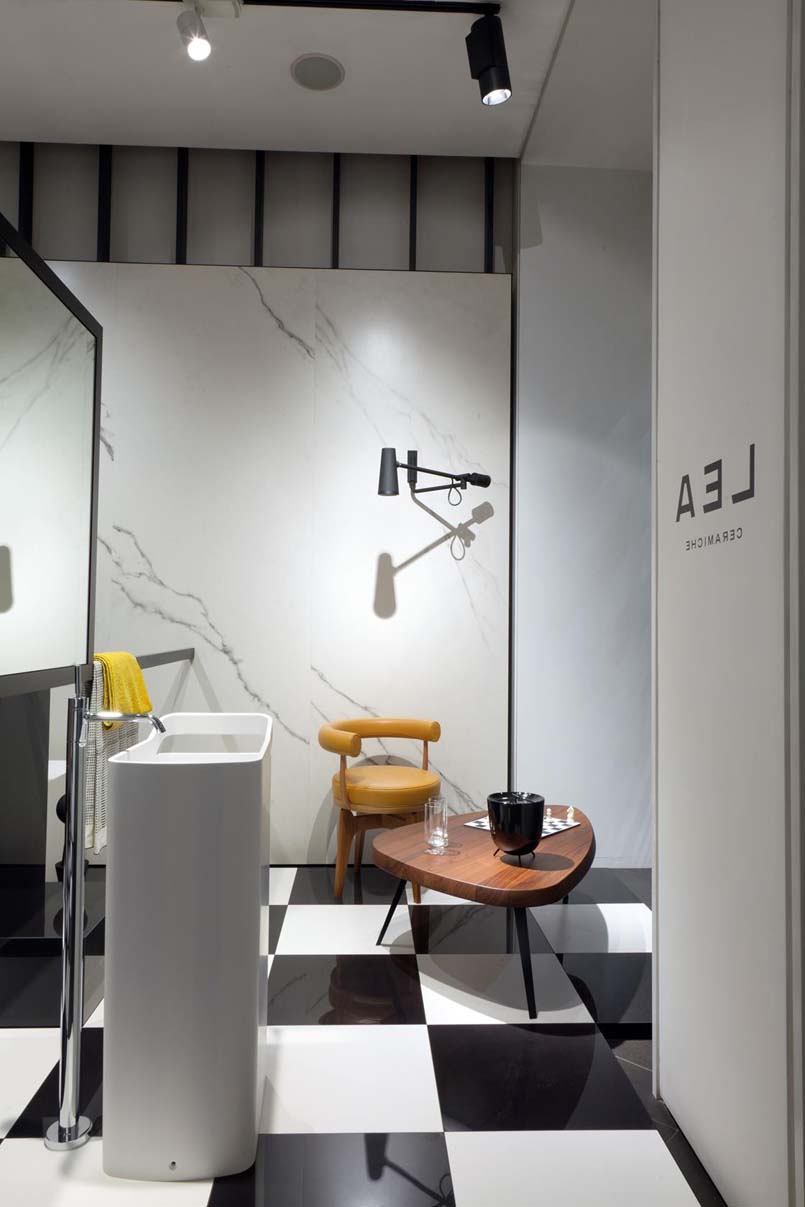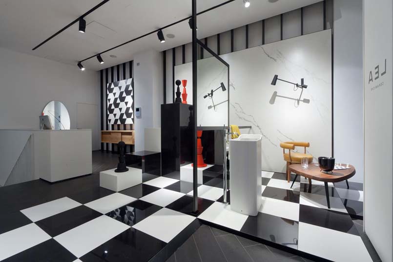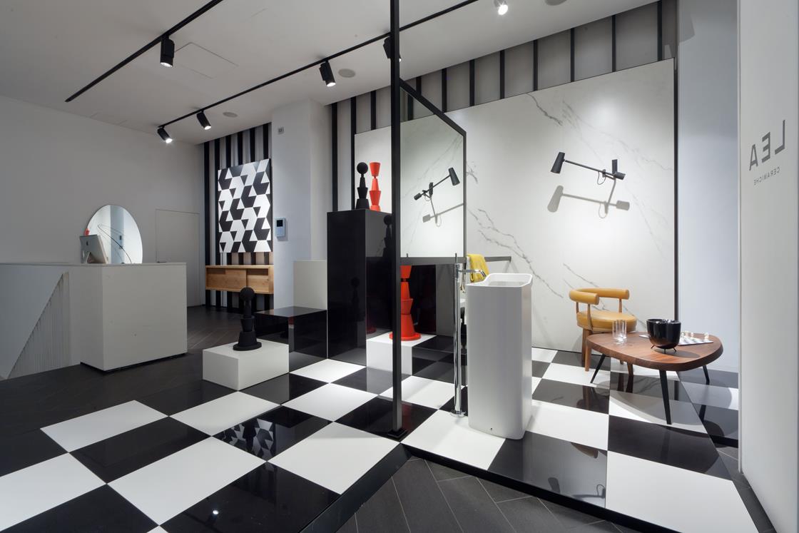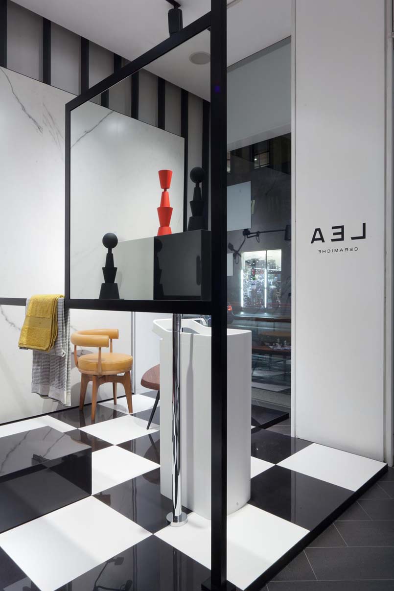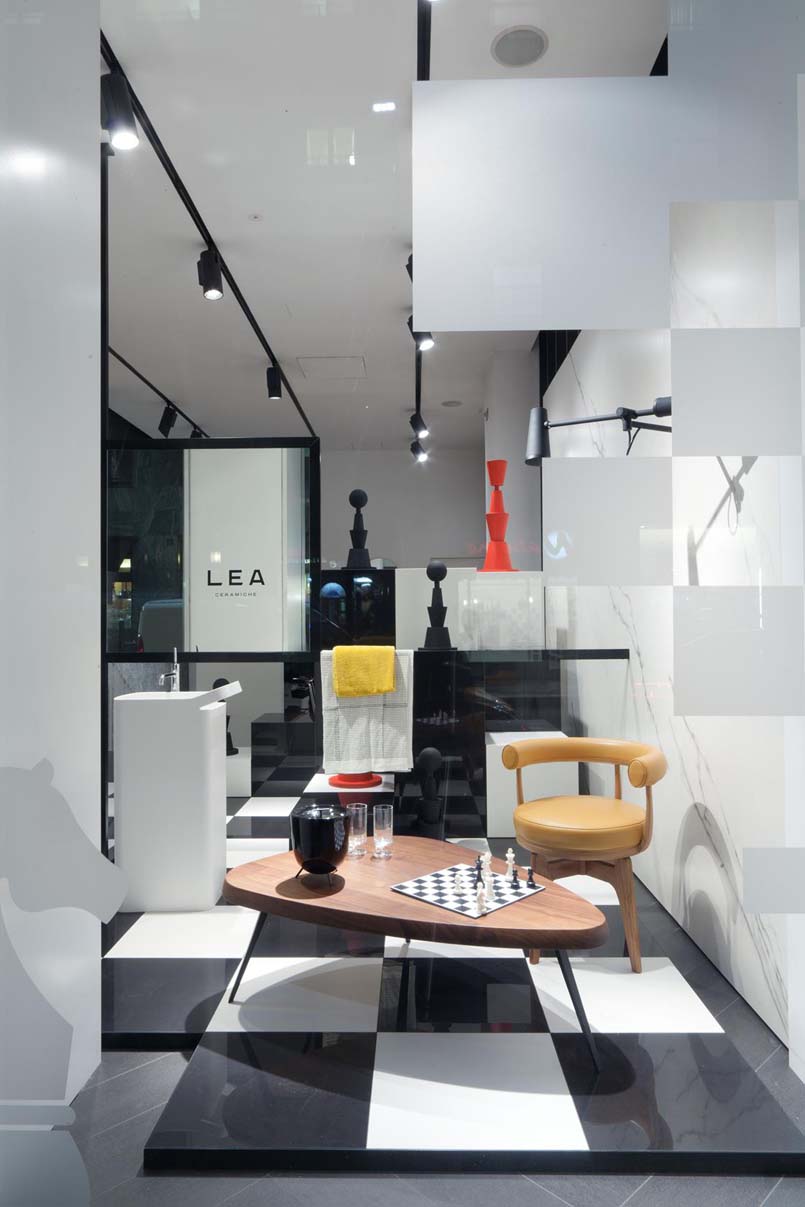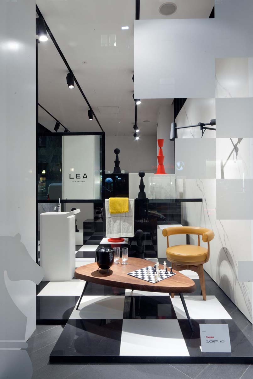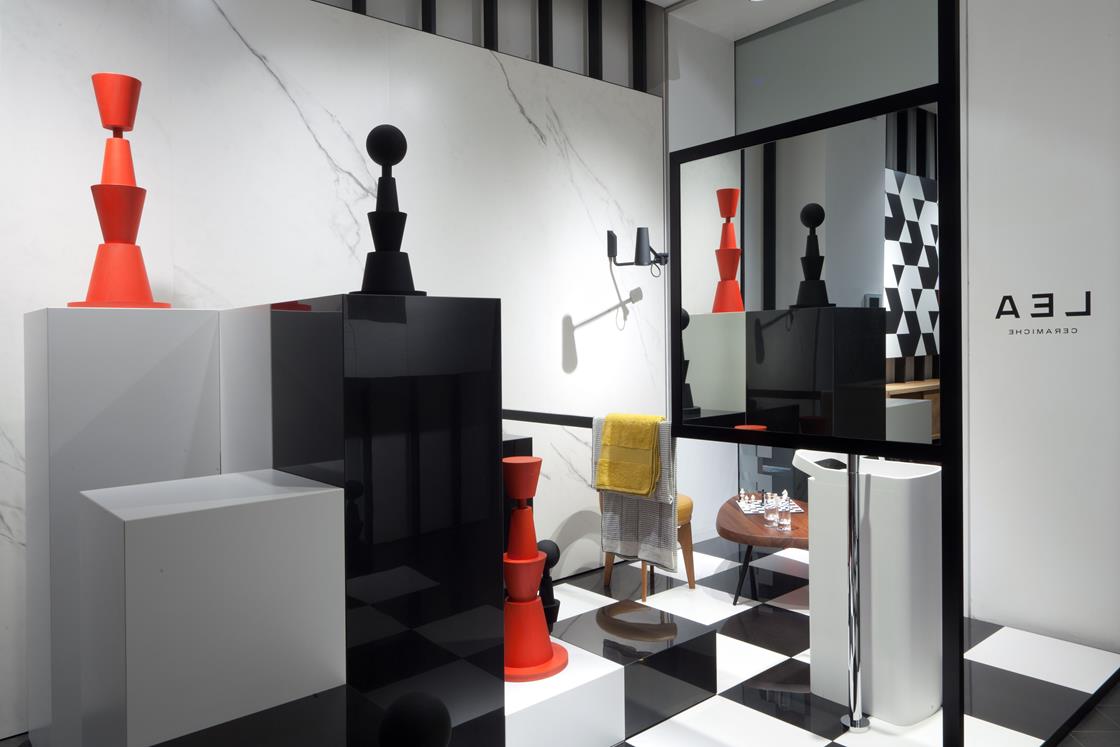 Firmato da Diego Grandi, lo spazio presenta un ironico rifacimento del gioco a scacchi, in cui ambienti domestici dialogano con arredi iconici e con le nuove collezioni di Lea Ceramiche.