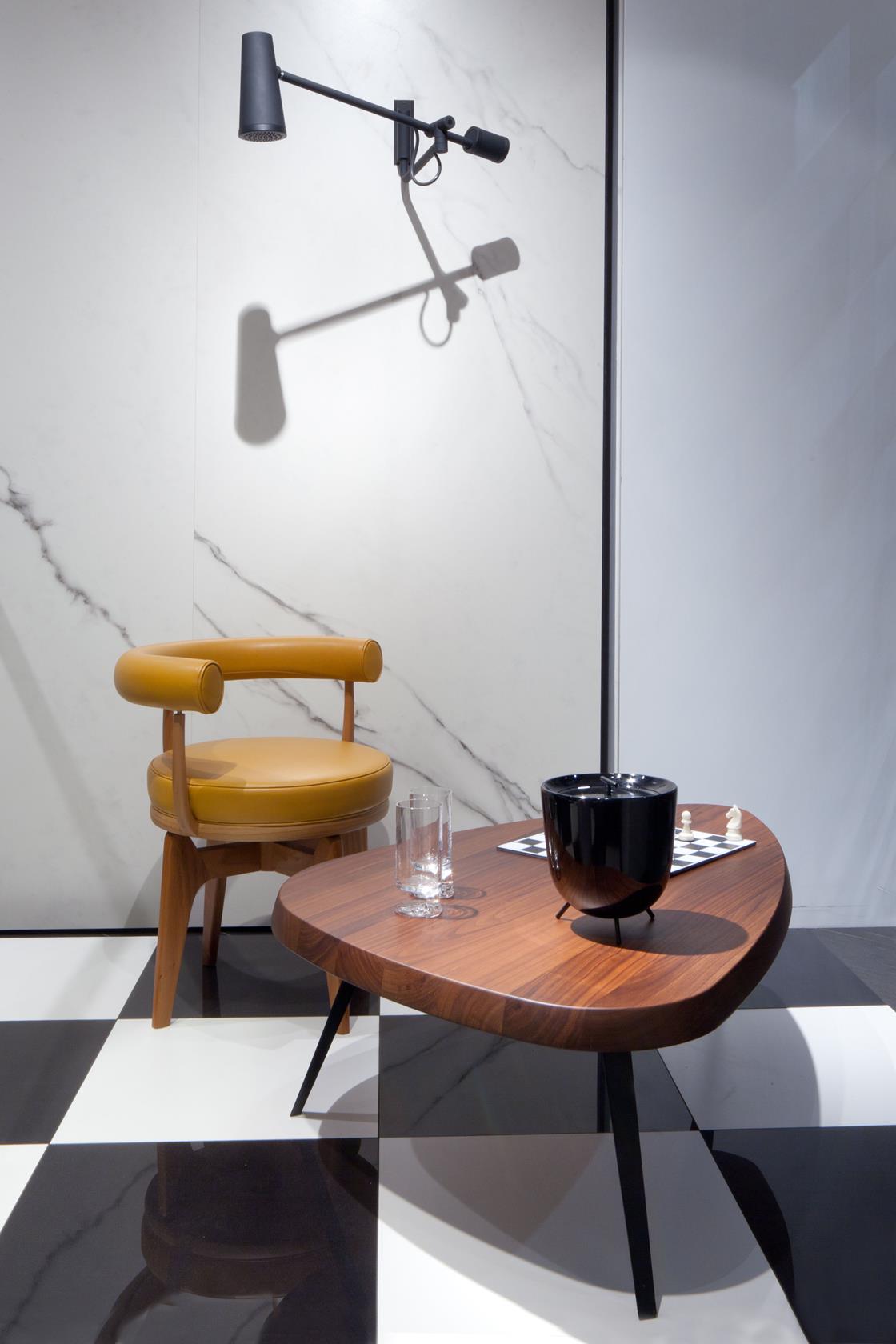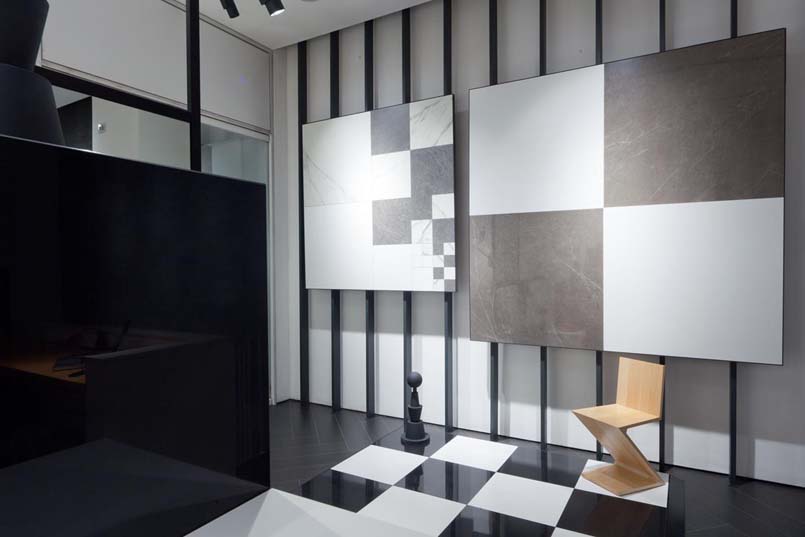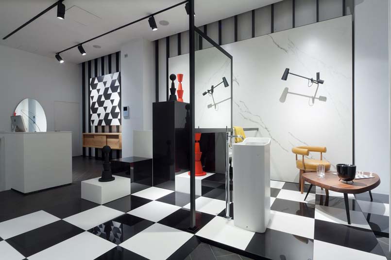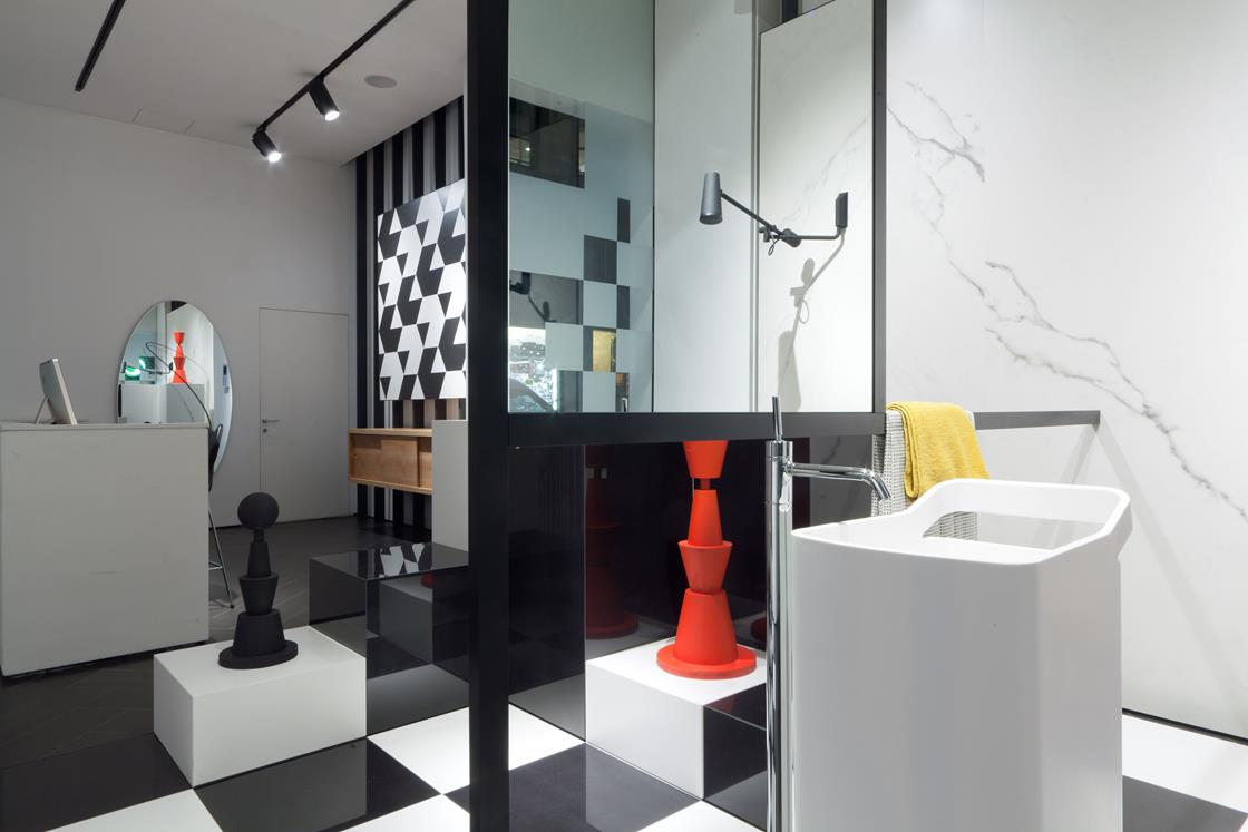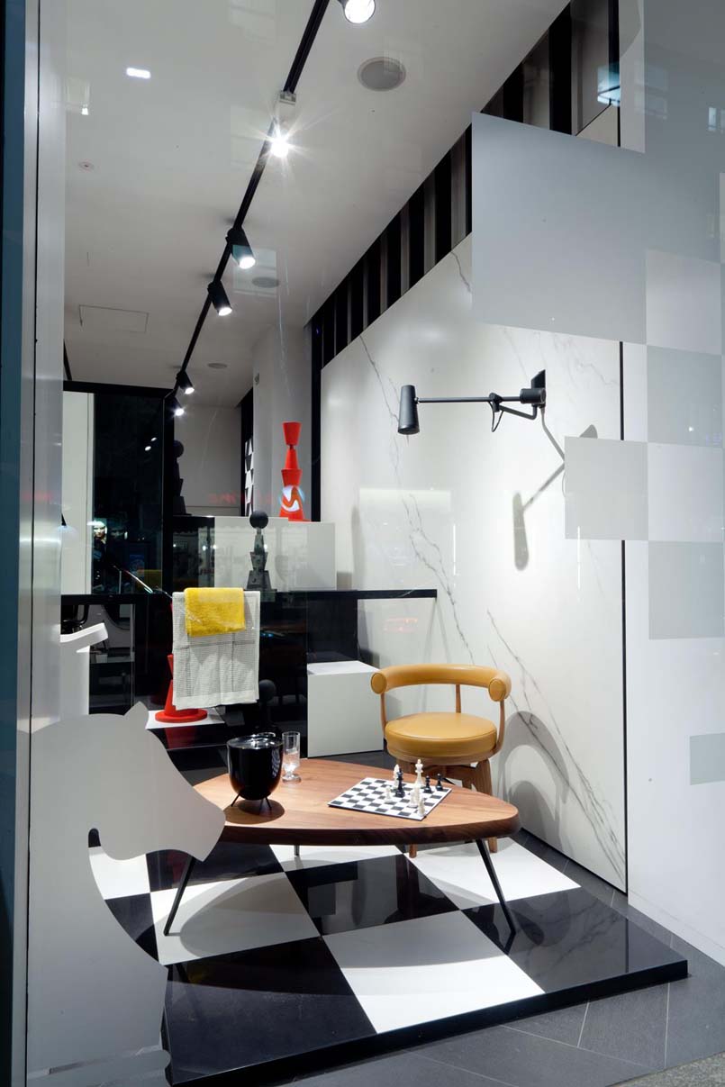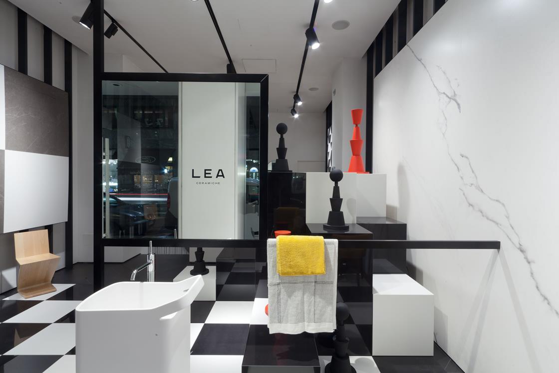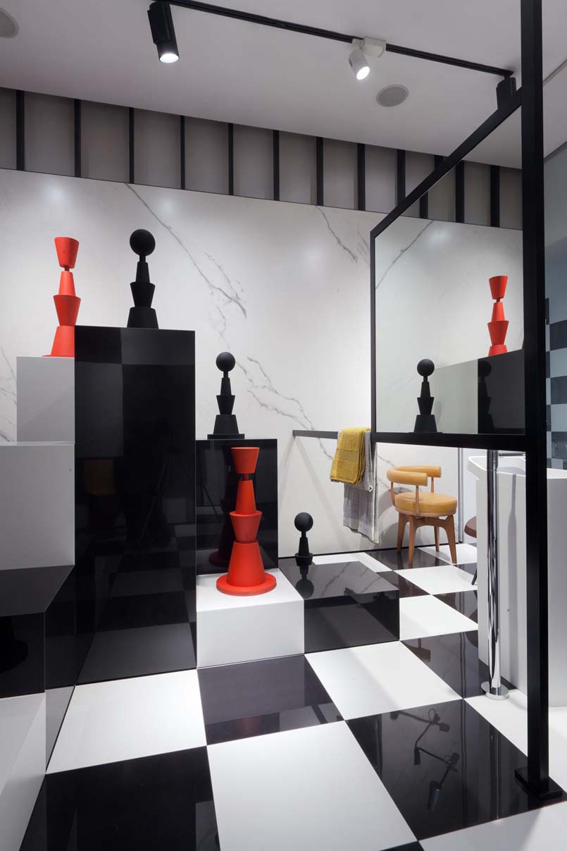 Firmato da Diego Grandi, lo spazio presenta un ironico rifacimento del gioco a scacchi, in cui ambienti domestici dialogano con arredi iconici e con le nuove collezioni di Lea Ceramiche.