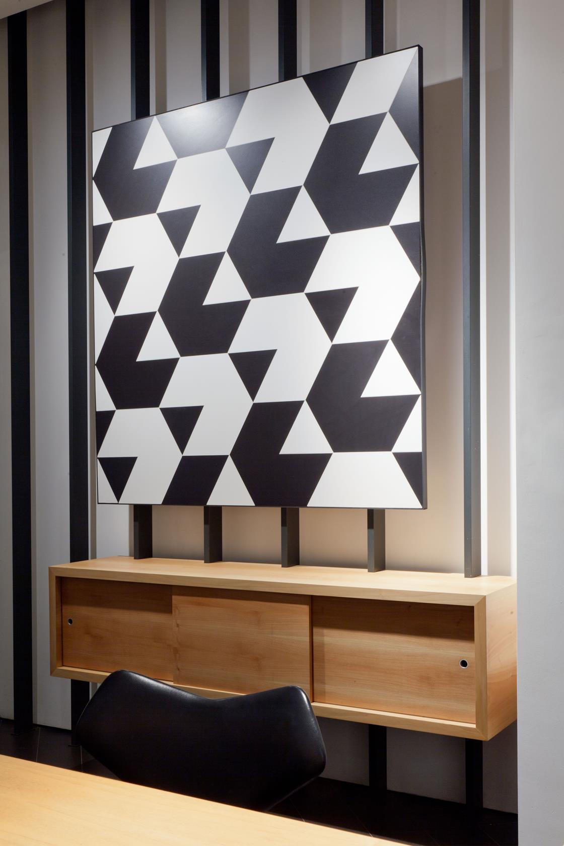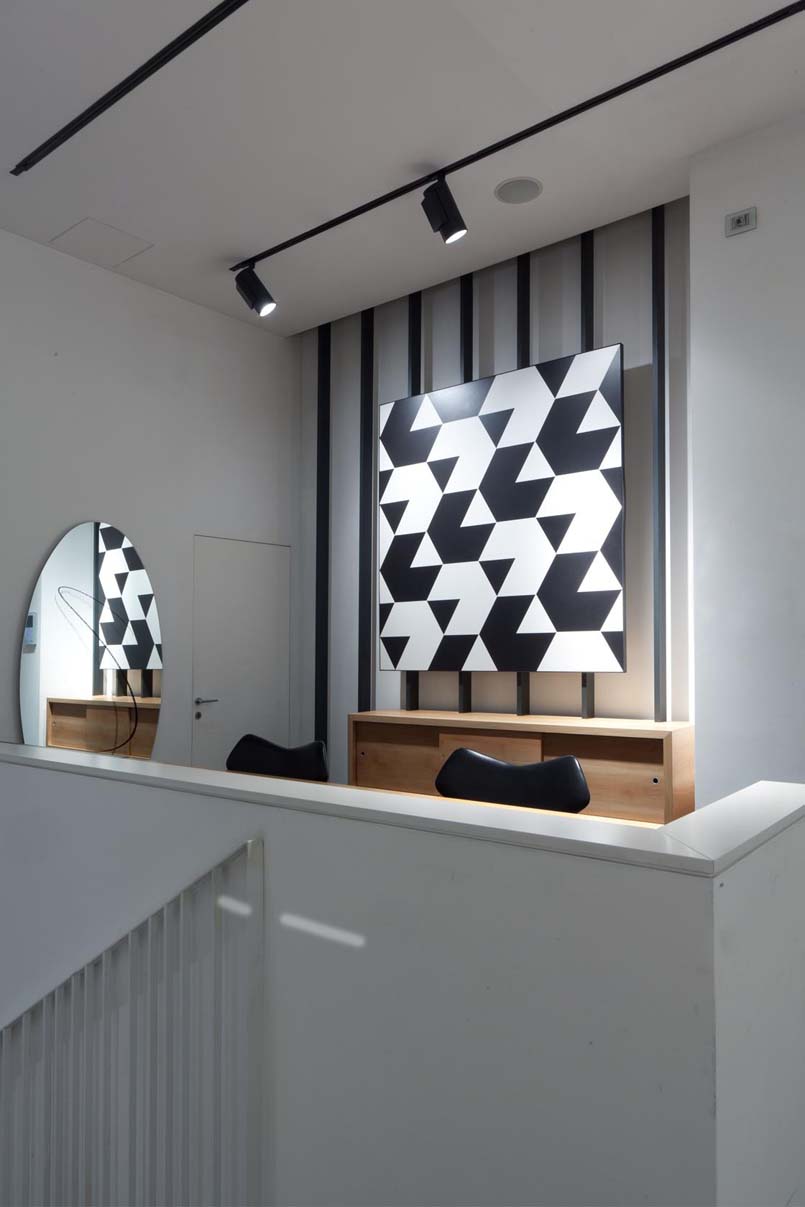 A pavimento, l’alternarsi del bianco e nero delle lastre Slimtech Absolute amplifica lo spazio e lo rende luminoso ed aperto grazie alla finitura lucida del gres laminato, ultima evoluzione della tecnica impensabile fino a poco tempo fa su spessori così ridotti.