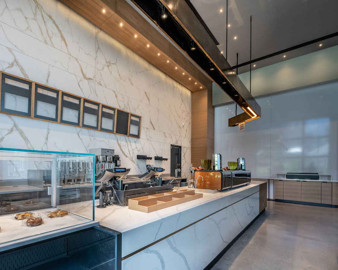 Per il cafè sono state selezionate preziose superfici al fine di creare un’atmosfera accogliente e seducente. È stata infatti utilizzata a rivestimento della parete posta dietro il bancone e del bancone stesso, la collezione Noblesse, che svela il racconto di 12 sofisticati marmi selezionati tra i più pregiati al mondo in un progetto ceramico completo, tra nuove sensazioni tattili, grandi formati e decori preziosi.