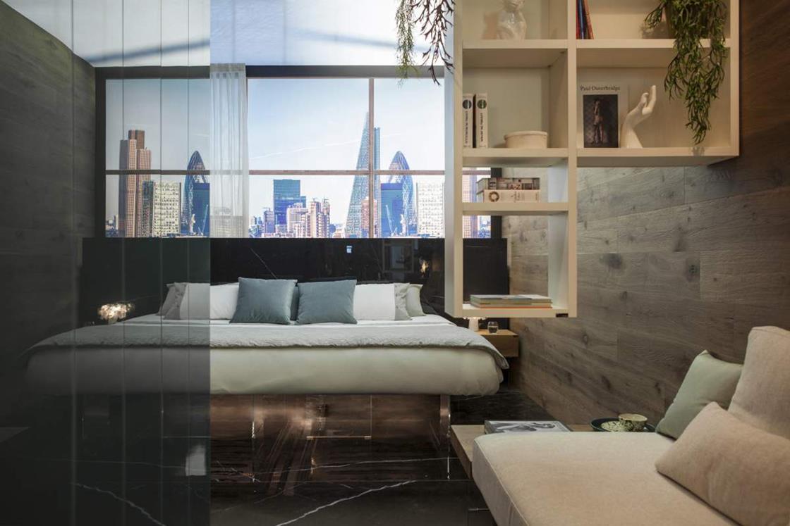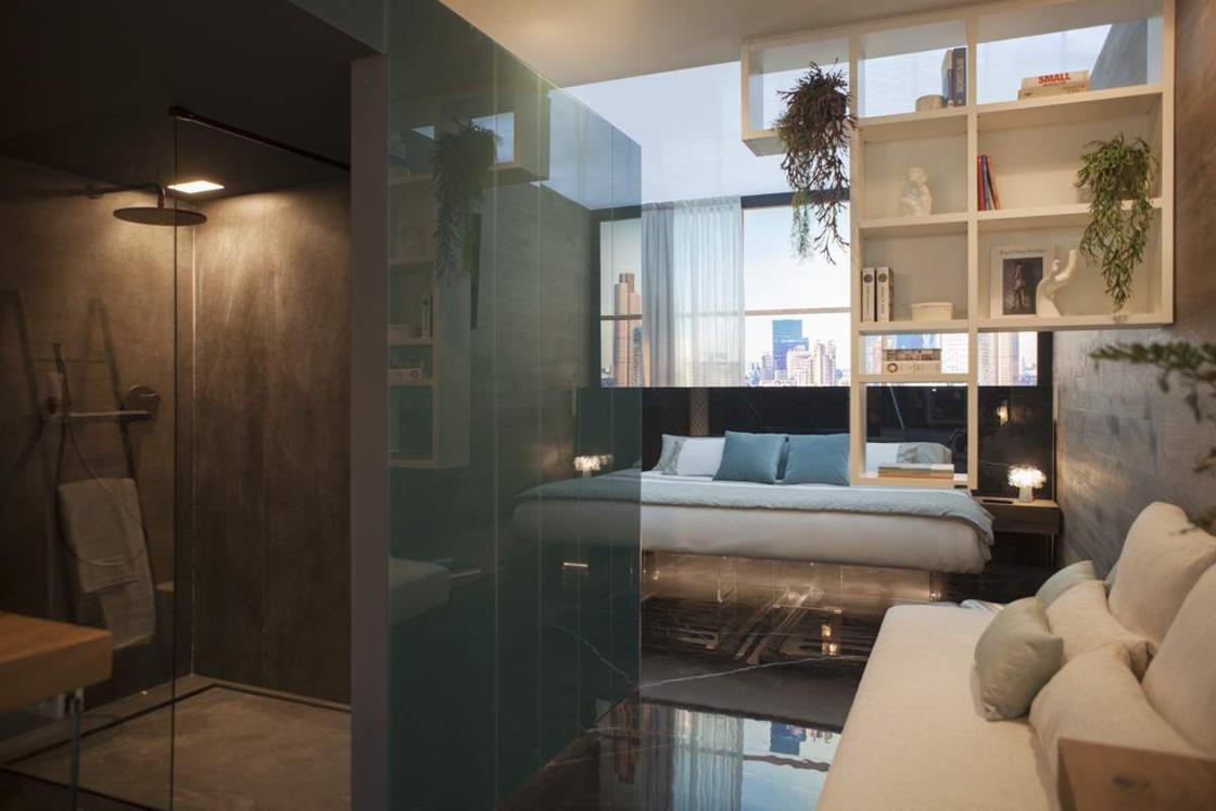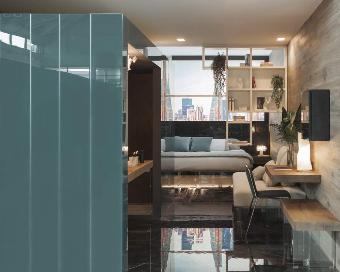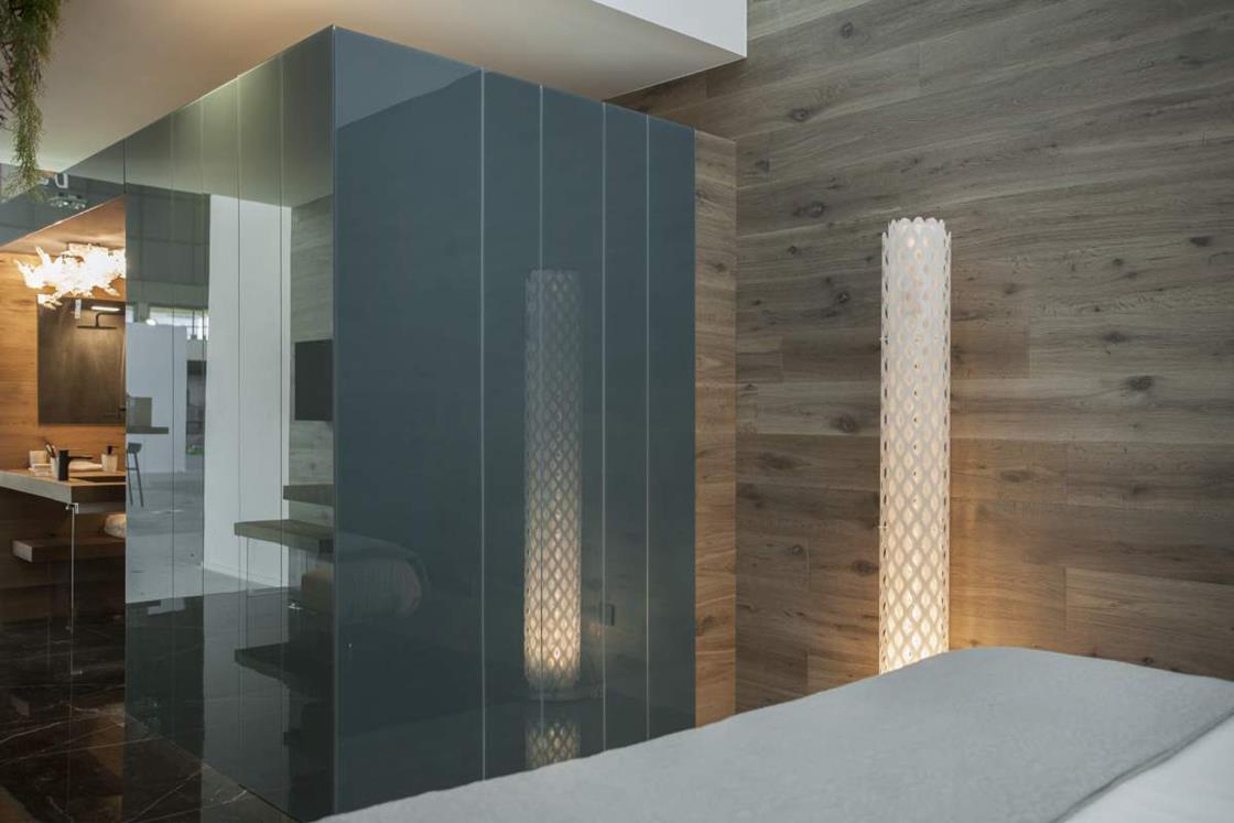 Le superfici della collezione Concreto di Lea Ceramiche hanno personalizzato gli spazi di ‘The BED-Room’, allestimento curato da LAGO Studio al ROOMS-SIA Hotel Design Lab di Rimini, in collaborazione con MAD051.
