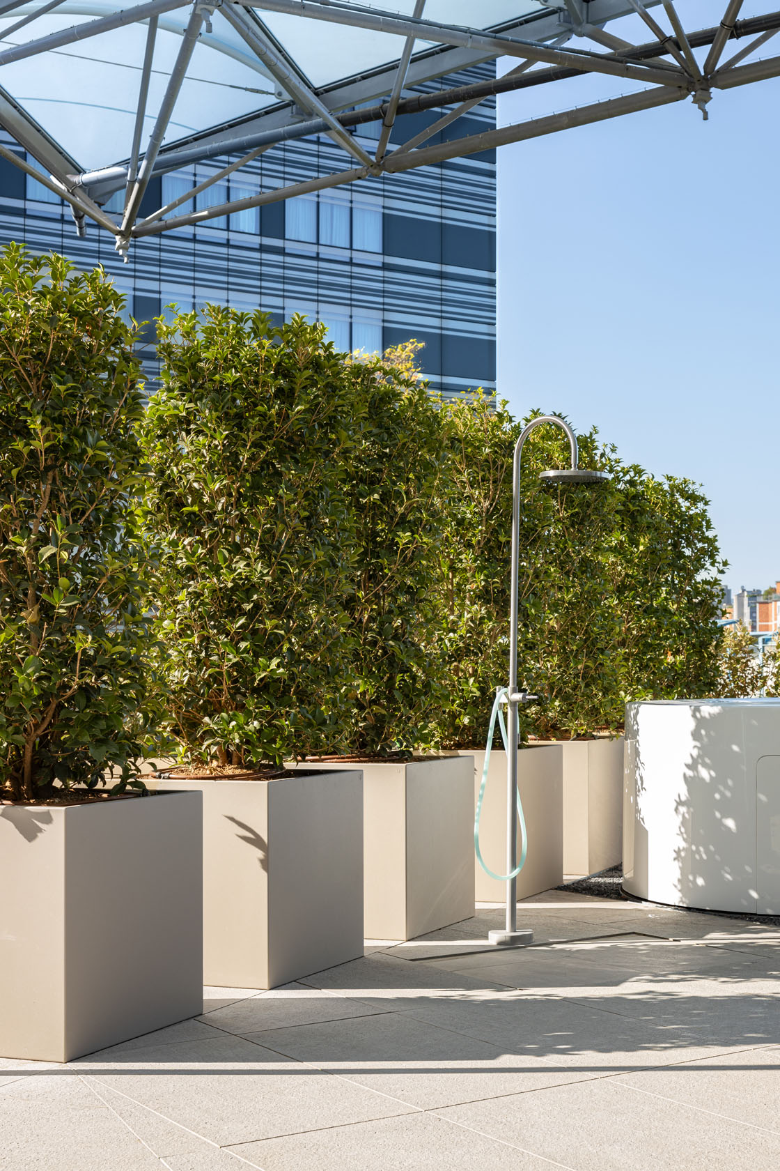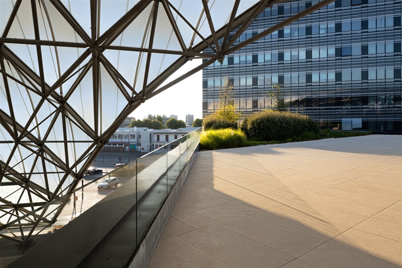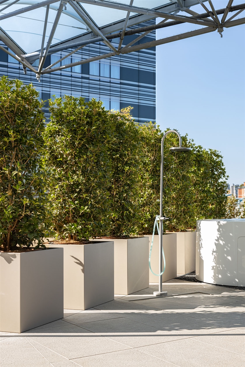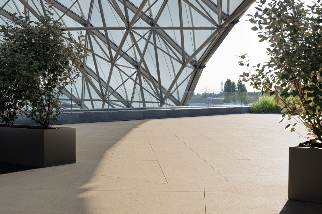 Assoluta protagonista della terrazza di copertura del Complesso Multifunzionale di Via Larga è la collezione Nextone di Lea Ceramiche, scelta nella luminosa tonalità Taupe della versione outdoor da 20 mm.