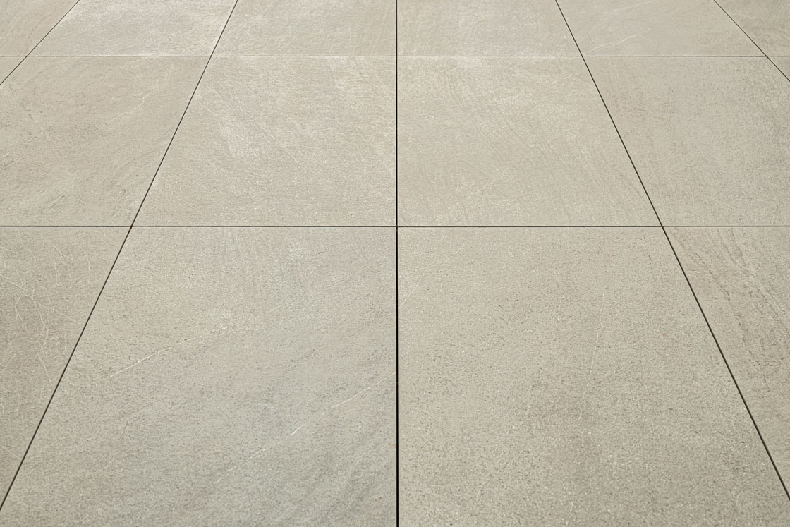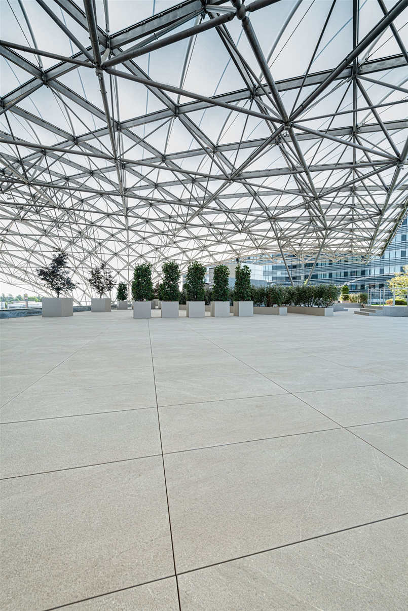 Si tratta di un grès porcellanato effetto pietra appositamente ingegnerizzato. Ispirato a pietre provenienti da quattro diverse cave, combinate in modo inedito, per crearne una nuova, non esistente in natura, dall’estetica naturale ed equilibrata. La scelta di posa è stata quella di un pavimento sopraelevato per consentire alle piastrelle di assorbire i movimenti dilatatori causati dagli sbalzi di temperatura, tipici del susseguirsi delle stagioni. Questa tipologia di pavimentazione, grazie al solo appoggio meccanico delle piastrelle su opportuni supporti e senza l’uso di colle, permette di preservarne l’integrità e di mantenere l’aspetto della zona outdoor per un lungo periodo di tempo.