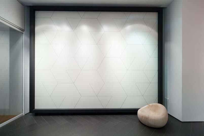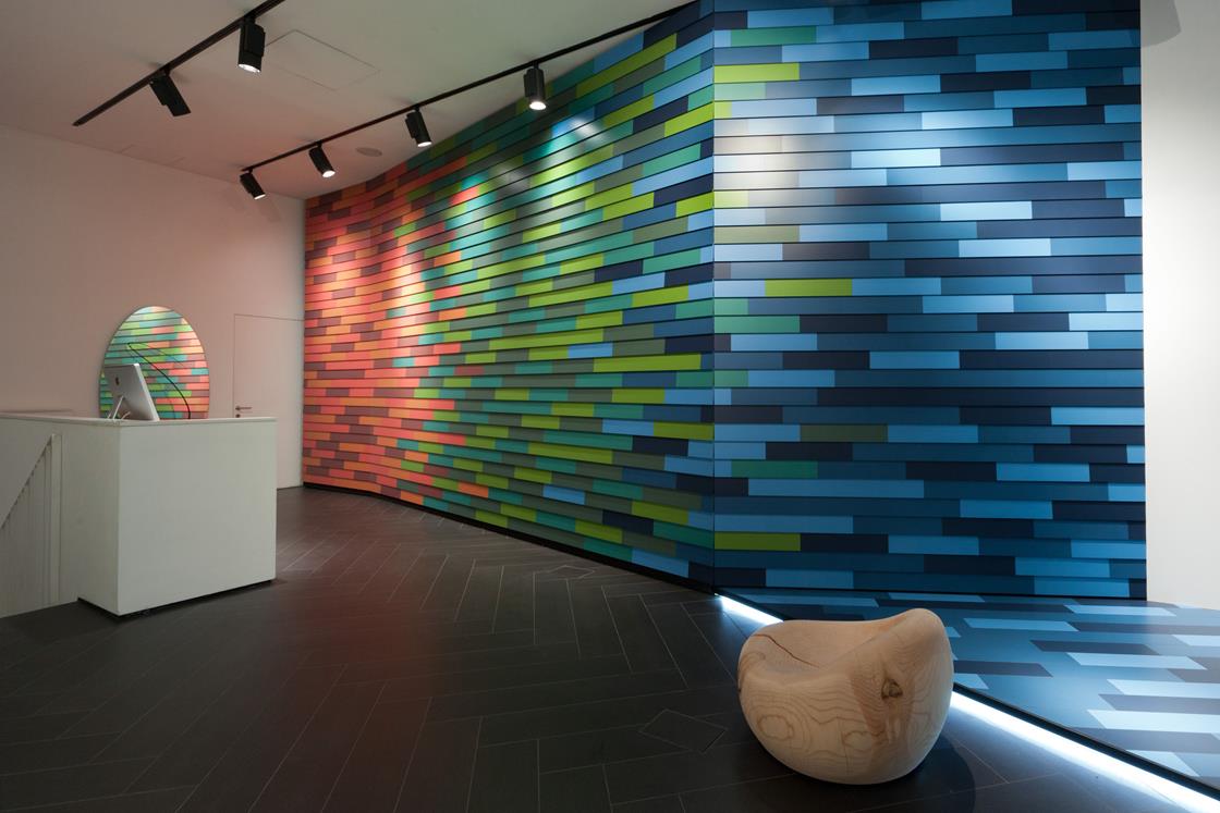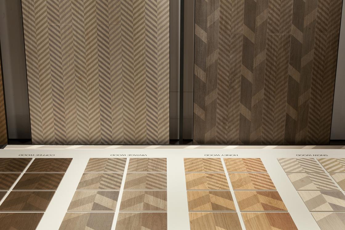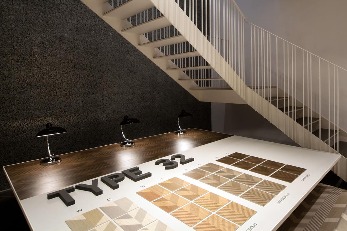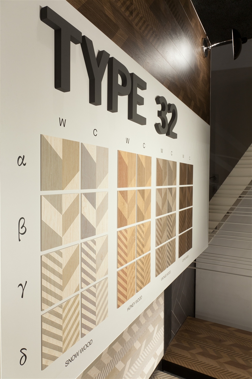Al piano inferiore, una nuova presentazione di Type-32, firmata da Diego Grandi. L’allestimento mette in luce le caratteristiche intrinseche del progetto: in forma quasi didascalica vengono evidenziate le varianti cromatiche e grafiche del prodotto, mentre a parete e a pavimento esempi di possibili combinazioni.
