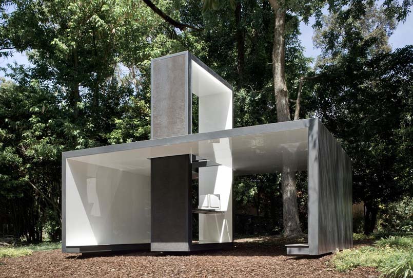 La struttura è contraddistinta da un volume a forma di parallelepipedo rettangolare e da un transetto centrale che interseca perpendicolarmente il soffitto ospitando i due simboli principali della cappella: l’altare e il leggio. Il progetto presenta anche un forte contrasto cromatico dato dall’utilizzo di lastre in gres laminato ultrasottili con una texture ispirata al ferro, e lastre bianco lucido scelte per ottenere un effetto di riflesso dell’ambiente naturale all’interno di esso.