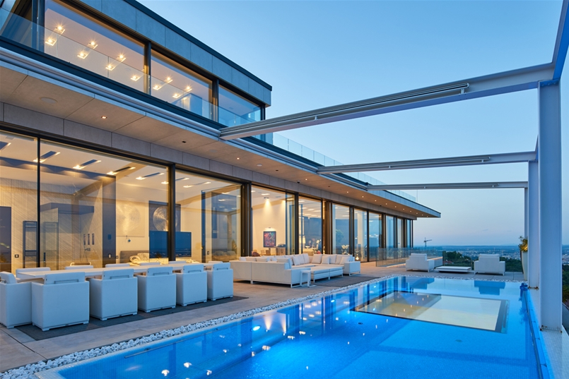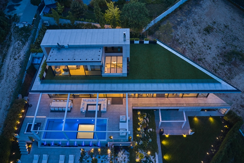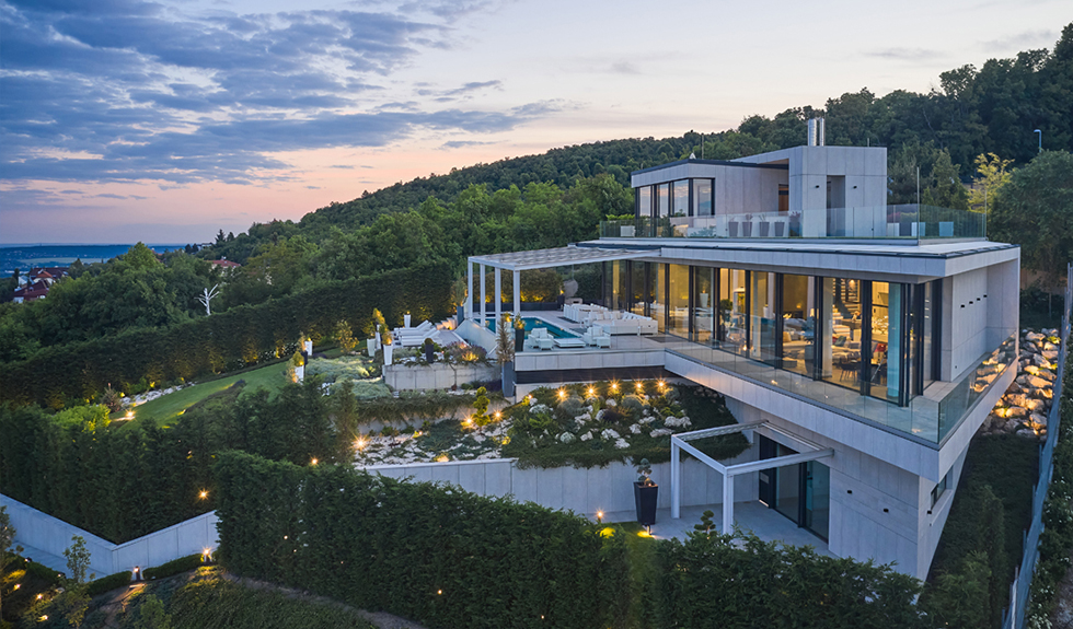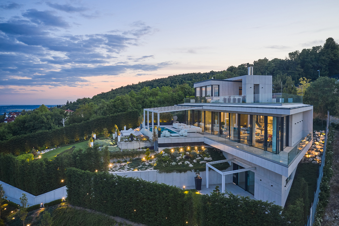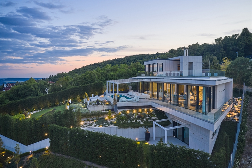 Una villa spettacolare, dalla morfologia peculiare, a tratti aguzza e decisa, in ogni caso ultramoderna, immersa nel verde del 12esimo distretto di una città suggestiva come Budapest. Disposta su più livelli, la sontuosa residenza ha una bianca facciata ventilata che contrasta piacevolmente con il verde del paesaggio circostante.