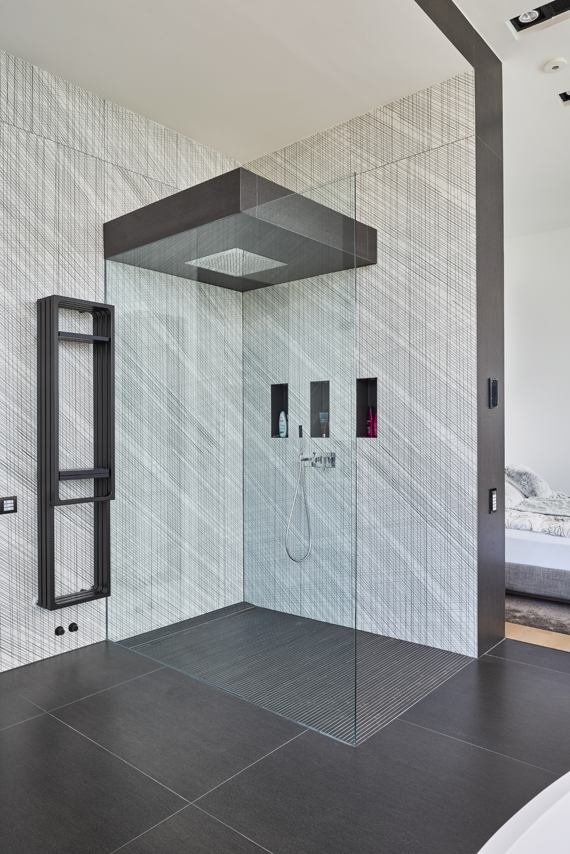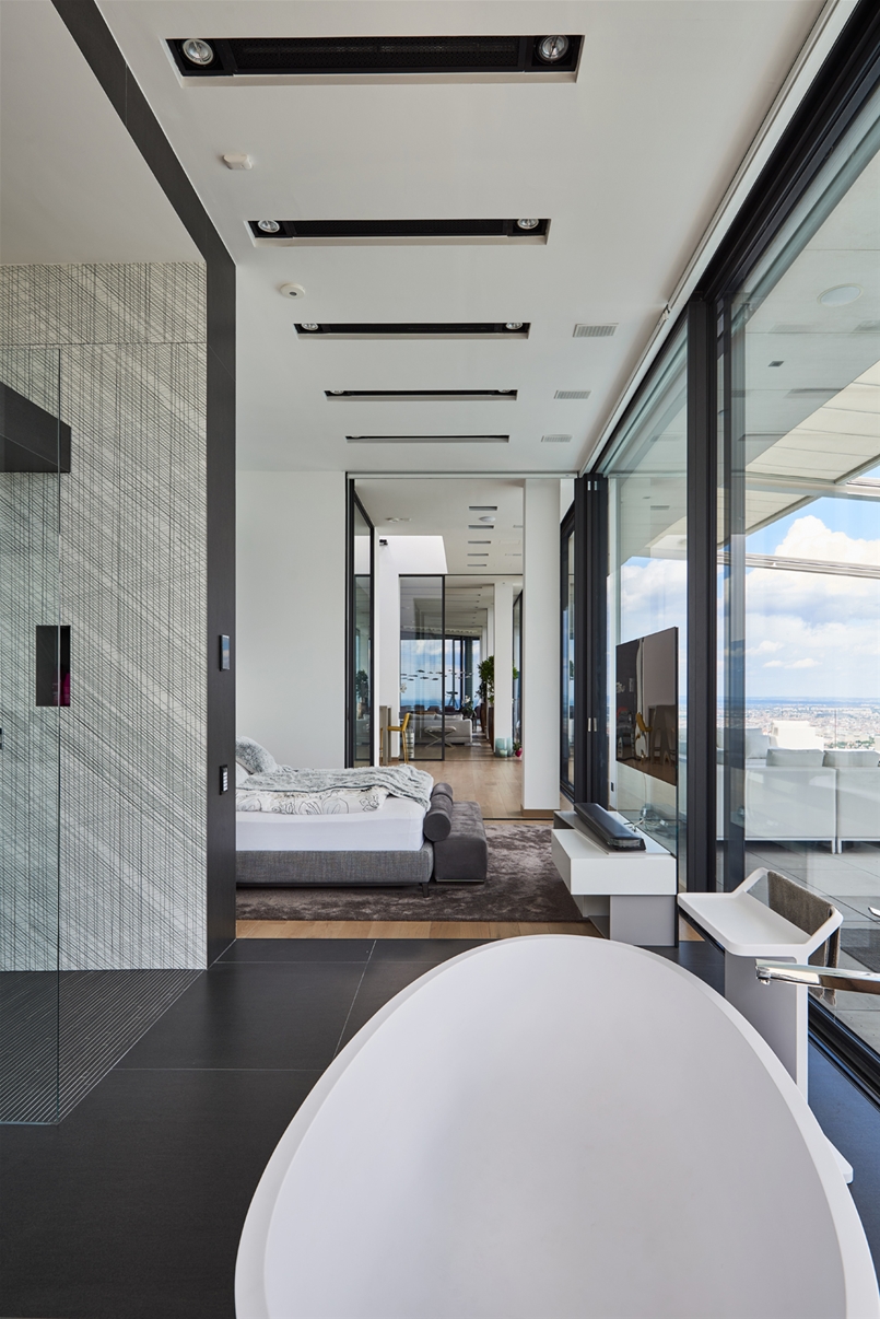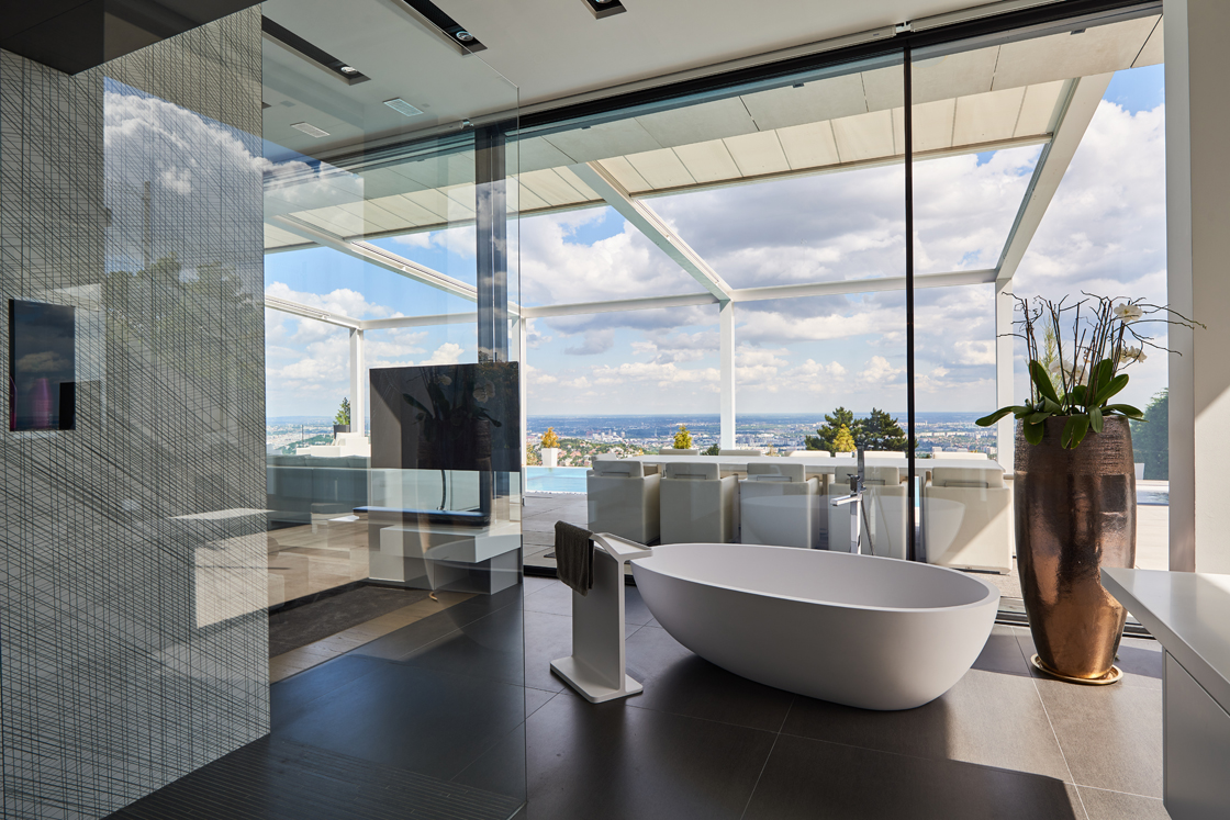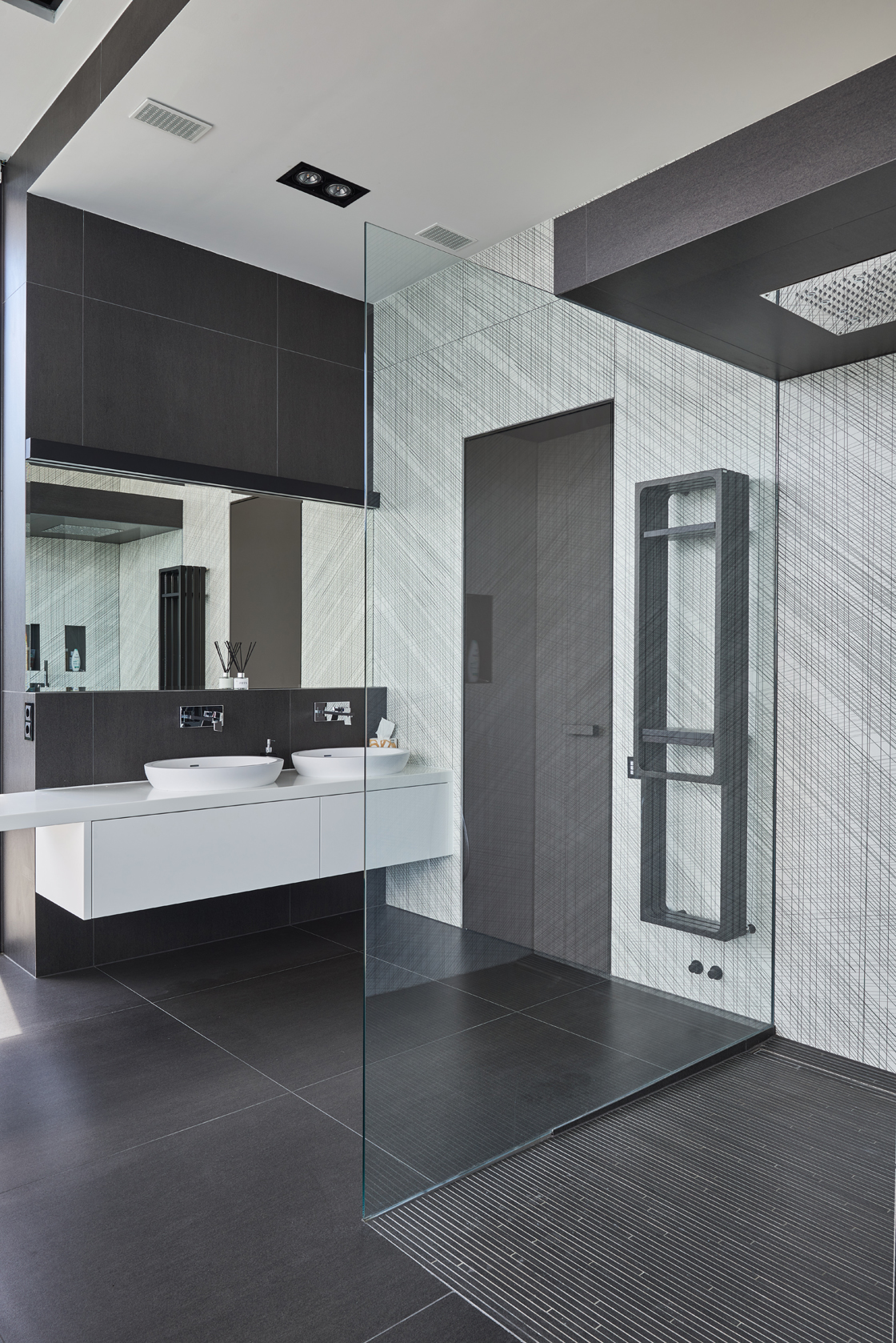 Nei bagni e in cucina è il design che regna incontrastato. Le superfici di grande impatto estetico e dalle notevoli prestazioni tecniche di Lea Ceramiche risultano perfettamente in linea con il progetto all’avanguardia di questa villa sviluppato dall’ungherese Nara Studio. In alcuni bagni, spicca l’eleganza delle piastrelle Slimtech Absolute Total White che si alterna all’effetto ottico a onde del rivestimento Waves, firmato Patrick Norguet. Sempre nei bagni e sempre frutto della collaborazione con il designer francese, la collezione Naive, incontro fra design e tecnologia, fra artigianato e industria, fra grès porcellanato e smalti per un effetto grafico che ricorda linee a matita tracciate a mano. E ancora, la collezione Basaltina Stone Project con spessore 3,5 mm, che si ispira alla pietra naturale, con un look minimal e suggestivo. In cucina, infine, trovano spazio le piastrelle della collezione City di Diego Grandi, la cui texture dall’effetto metallizzato e frutto di una straordinaria ricerca materica e tecnologica restituisce all’ambiente un grande fascino.