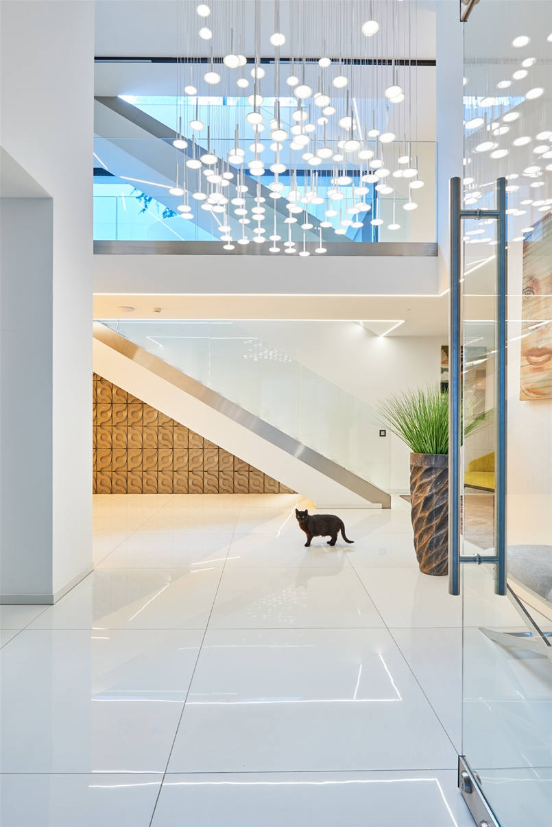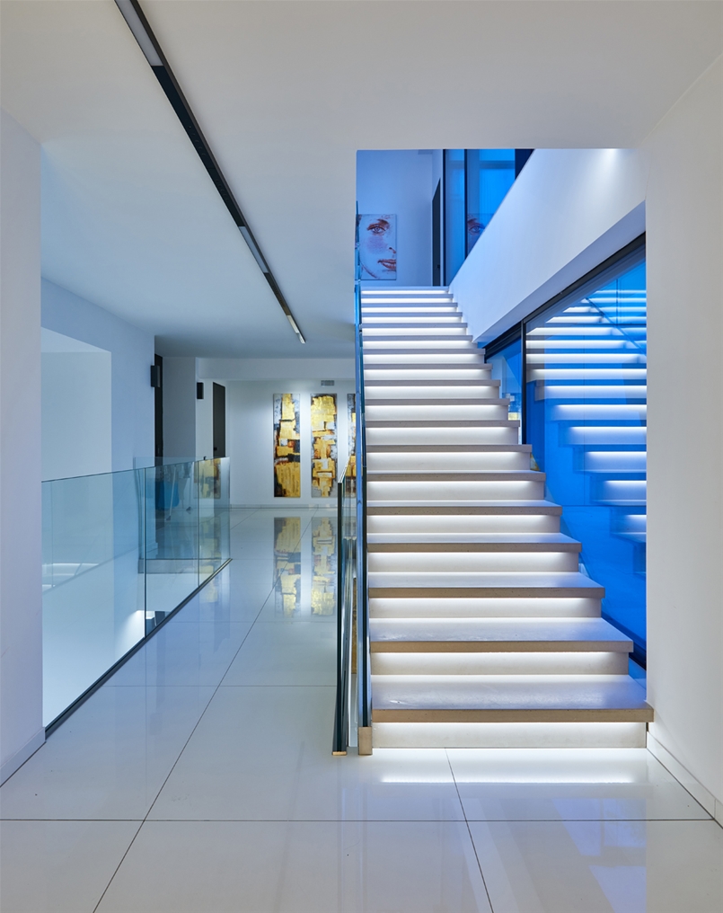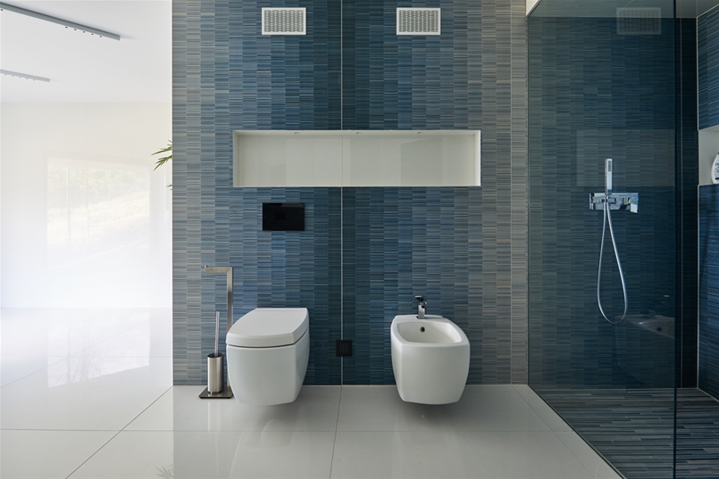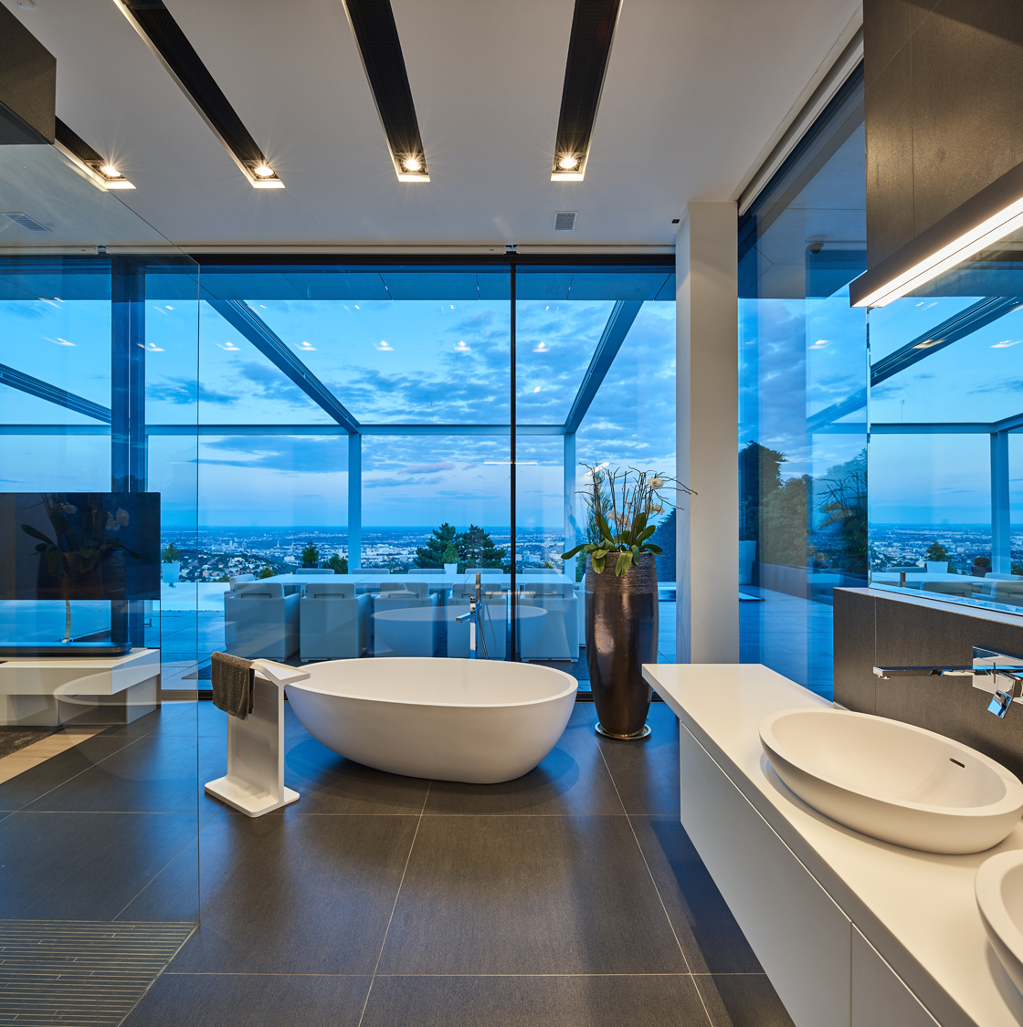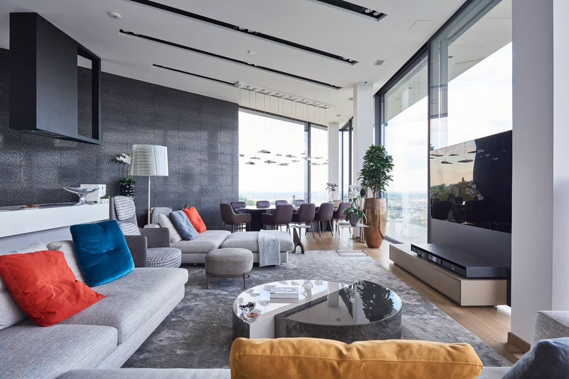 Nei bagni e in cucina è il design che regna incontrastato. Le superfici di grande impatto estetico e dalle notevoli prestazioni tecniche di Lea Ceramiche risultano perfettamente in linea con il progetto all’avanguardia di questa villa sviluppato dall’ungherese Nara Studio. In alcuni bagni, spicca l’eleganza delle piastrelle Slimtech Absolute Total White che si alterna all’effetto ottico a onde del rivestimento Waves, firmato Patrick Norguet. Sempre nei bagni e sempre frutto della collaborazione con il designer francese, la collezione Naive, incontro fra design e tecnologia, fra artigianato e industria, fra grès porcellanato e smalti per un effetto grafico che ricorda linee a matita tracciate a mano. E ancora, la collezione Basaltina Stone Project con spessore 3,5 mm, che si ispira alla pietra naturale, con un look minimal e suggestivo. In cucina, infine, trovano spazio le piastrelle della collezione City di Diego Grandi, la cui texture dall’effetto metallizzato e frutto di una straordinaria ricerca materica e tecnologica restituisce all’ambiente un grande fascino.