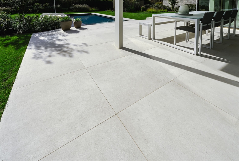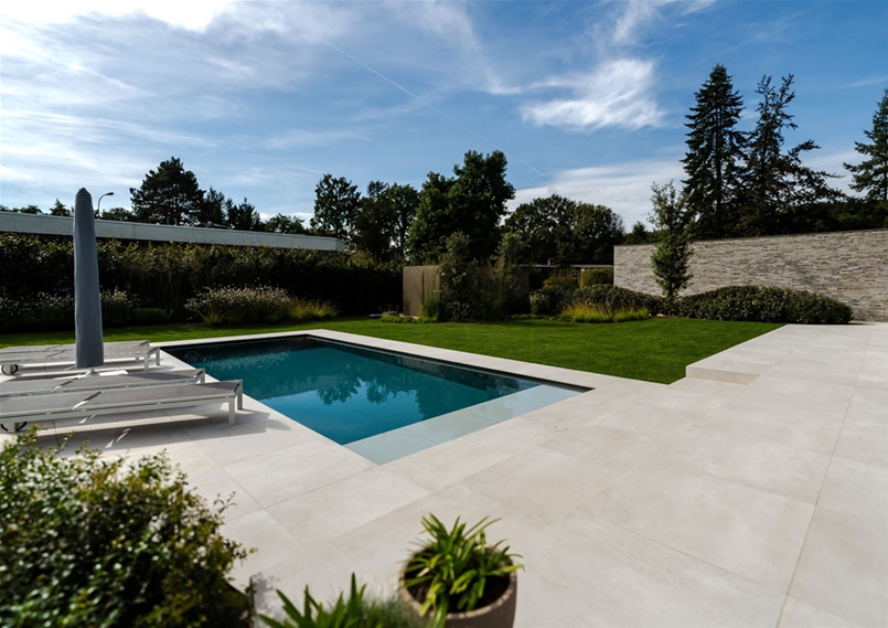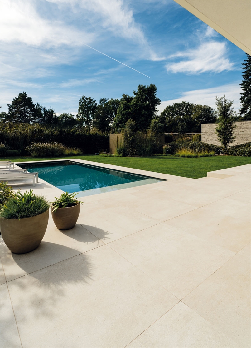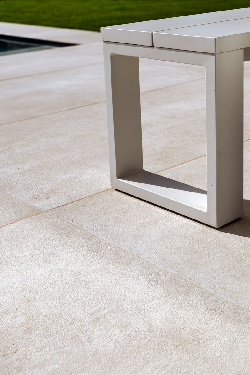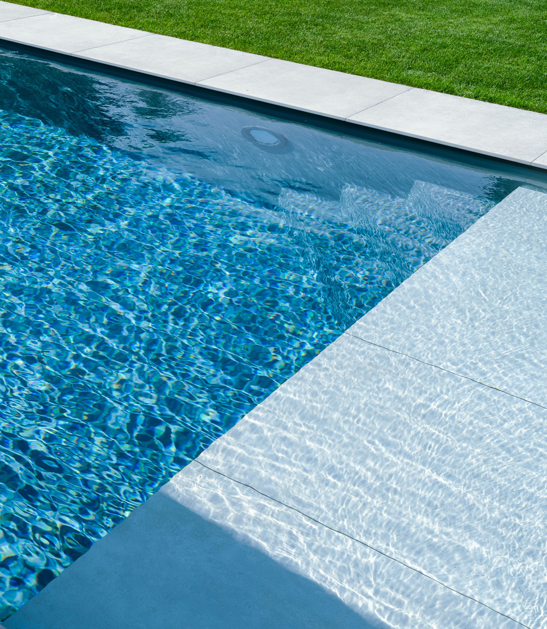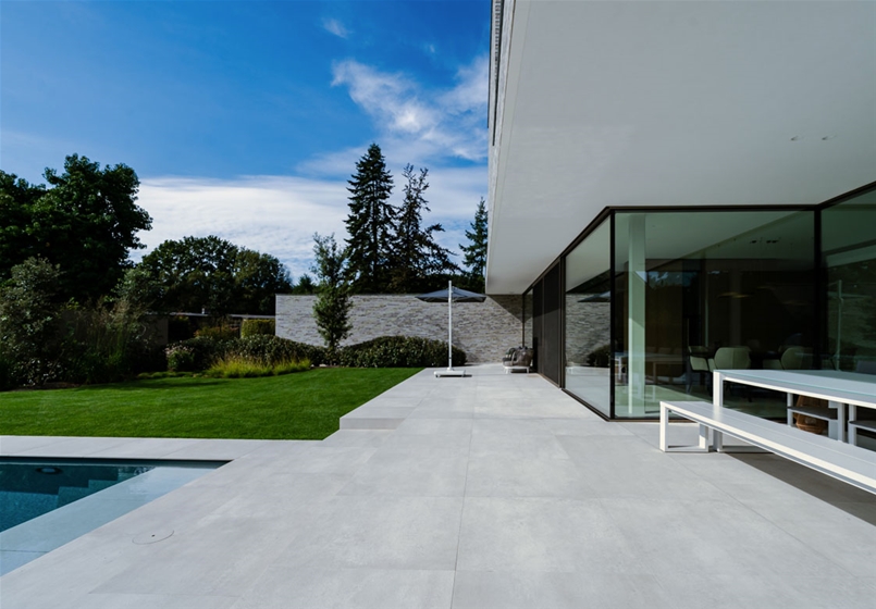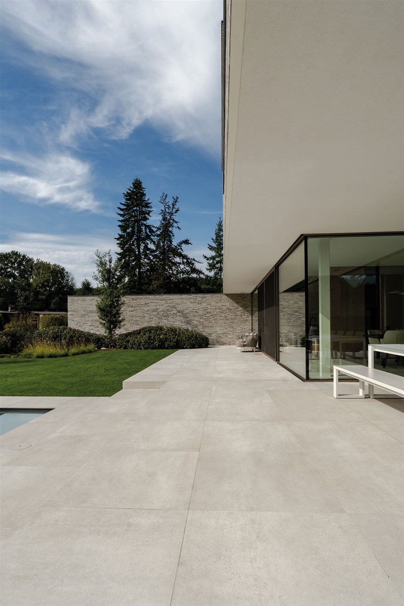Ad esaltare gli spazi della villa, la collezione Concreto by Fabio Novembre di Lea Ceramiche, capace di fondere minimalismo e design nella celebrazione estetica del cemento, materiale simbolo dell’architettura moderna. La collezione fa parte della proposta 3-Tech Project, ideale per rispondere a tutte le possibili destinazioni d’uso perché consente di ottenere continuità stilistica e performance tecnica mediante un solo codice estetico declinato in spessori differenti, per soddisfare le esigenze funzionali di ogni progetto. In questa realizzazione sono state utilizzate le lastre nel formato 90x90 cm nella calda e accogliente nuance Extra Light con spessore 9,5 mm per il pavimento degli ambienti interni della villa, mentre per il pavimento esterno della veranda e a bordo piscina nella medesima versione e formato ma nello spessore 20mm.