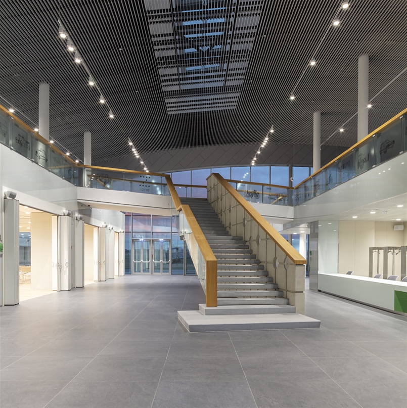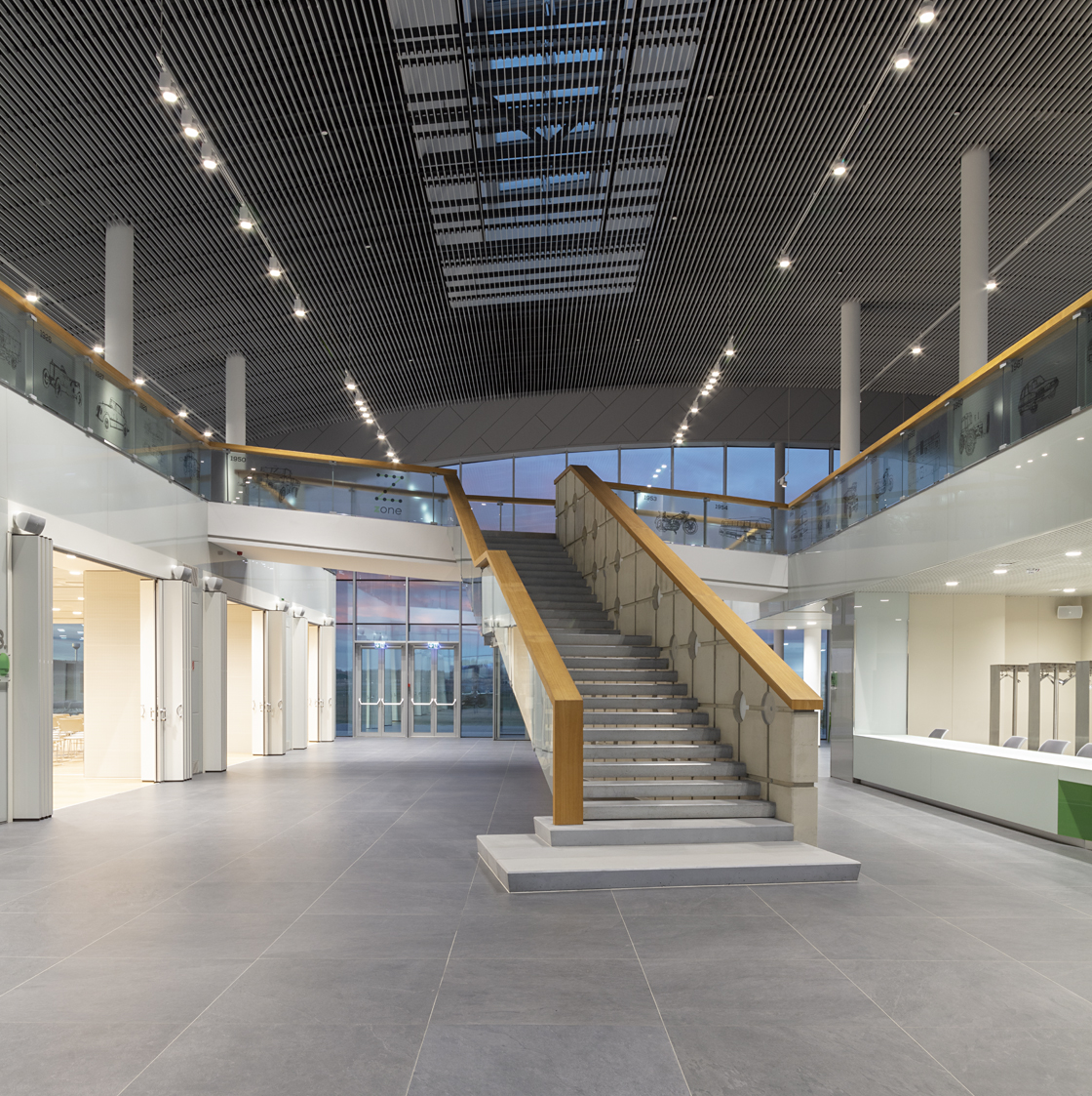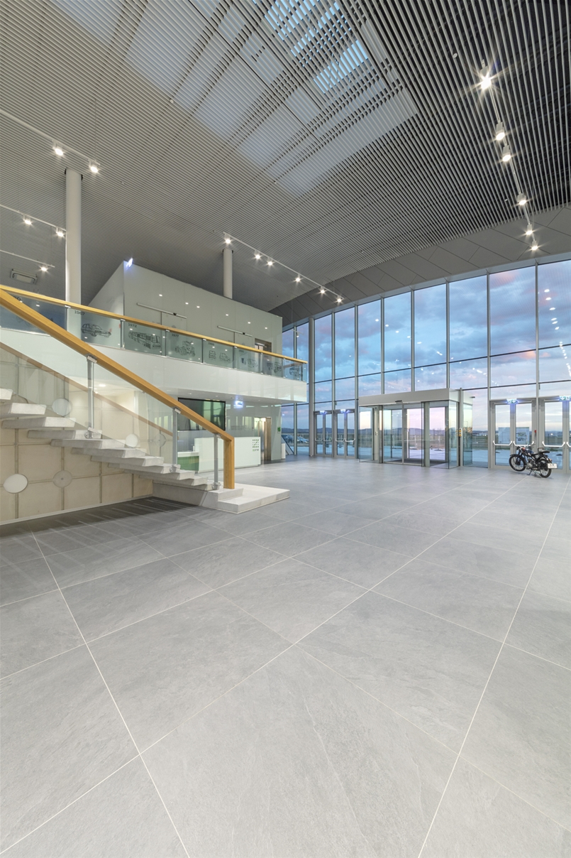 All’interno del sito, l’edificio principale fa da blocco centrale della pista di prova e da ingresso per i visitatori, ospitando spazi per eventi pubblici, diverse sale e uffici. Per la pavimentazione lo studio M-Teampannon Architecture and Engineering ha selezionato Slimtech Waterfall di Lea Ceramiche, una collezione ispirata all’ardesia e che riproduce in modo realistico gli effetti cangianti tipici delle pietre rocciose sedimentarie. Nel colore Silver Flow, Waterfall registra sulla superficie del gres laminato irregolarità e variazioni di colore, espressioni puntuali del trascorrere del tempo. Le grandi lastre dallo spessore di 5,5mm si combinano perfettamente da un punto di vista formale e funzionale con l’impronta architettonica dell’edificio, ma non solo.