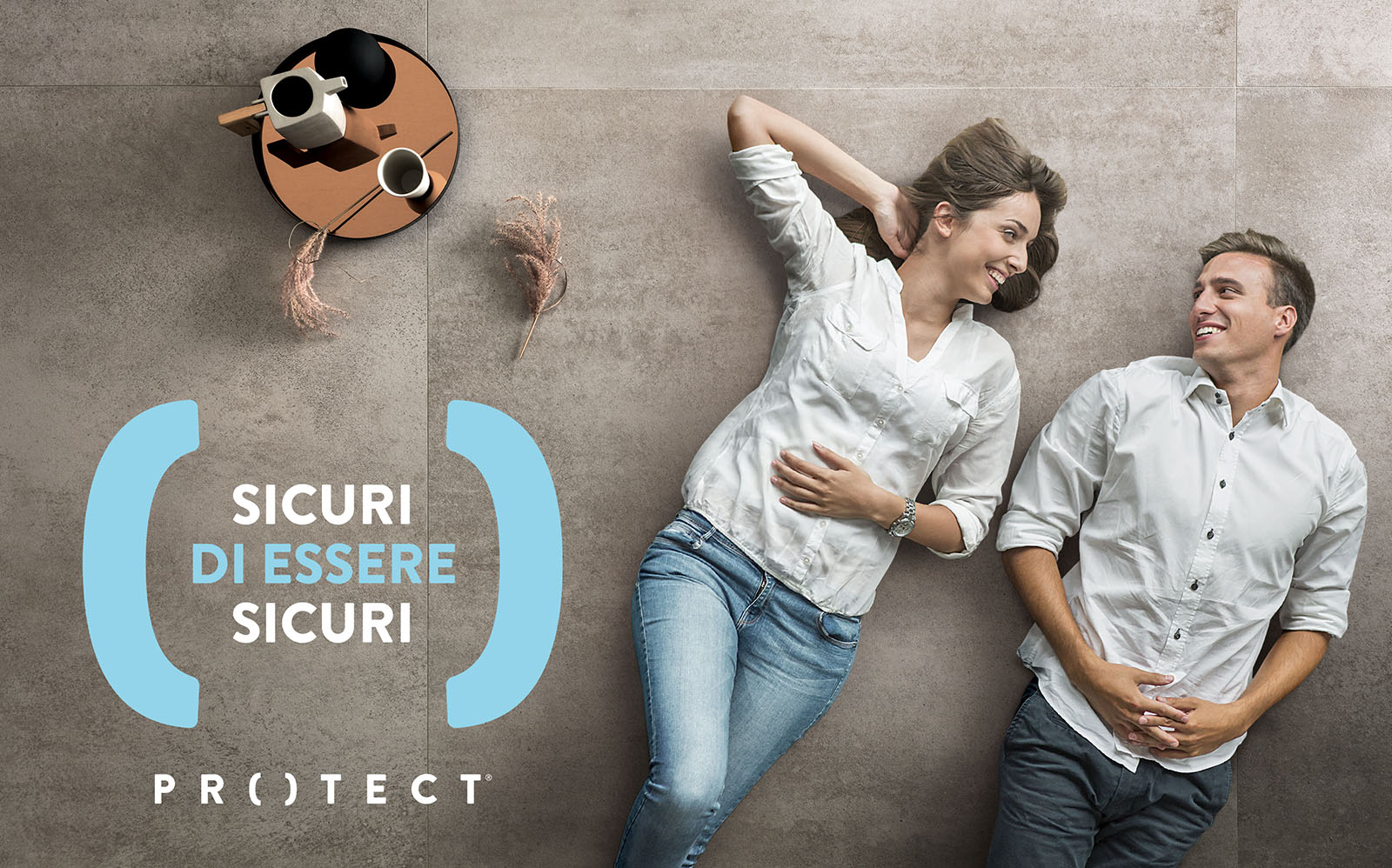 PROTECT® è una linea esclusiva di pavimenti e rivestimenti antibatterici in gres porcellanato ad altissime performance, per una casa sana, sicura e protetta. Le superfici ceramiche PROTECT® hanno un vero scudo antibatterico agli ioni d’argento incorporato nelle piastrelle, che elimina fino al 99,9% dei batteri dalla superficie. Il risultato? Pavimenti e rivestimenti sempre protetti, 24 ore su 24, giorno e notte, igiene e pulizia più facili, sicurezza in tutta la casa. Per sempre.